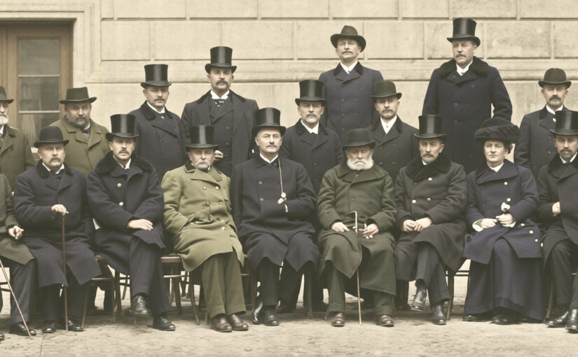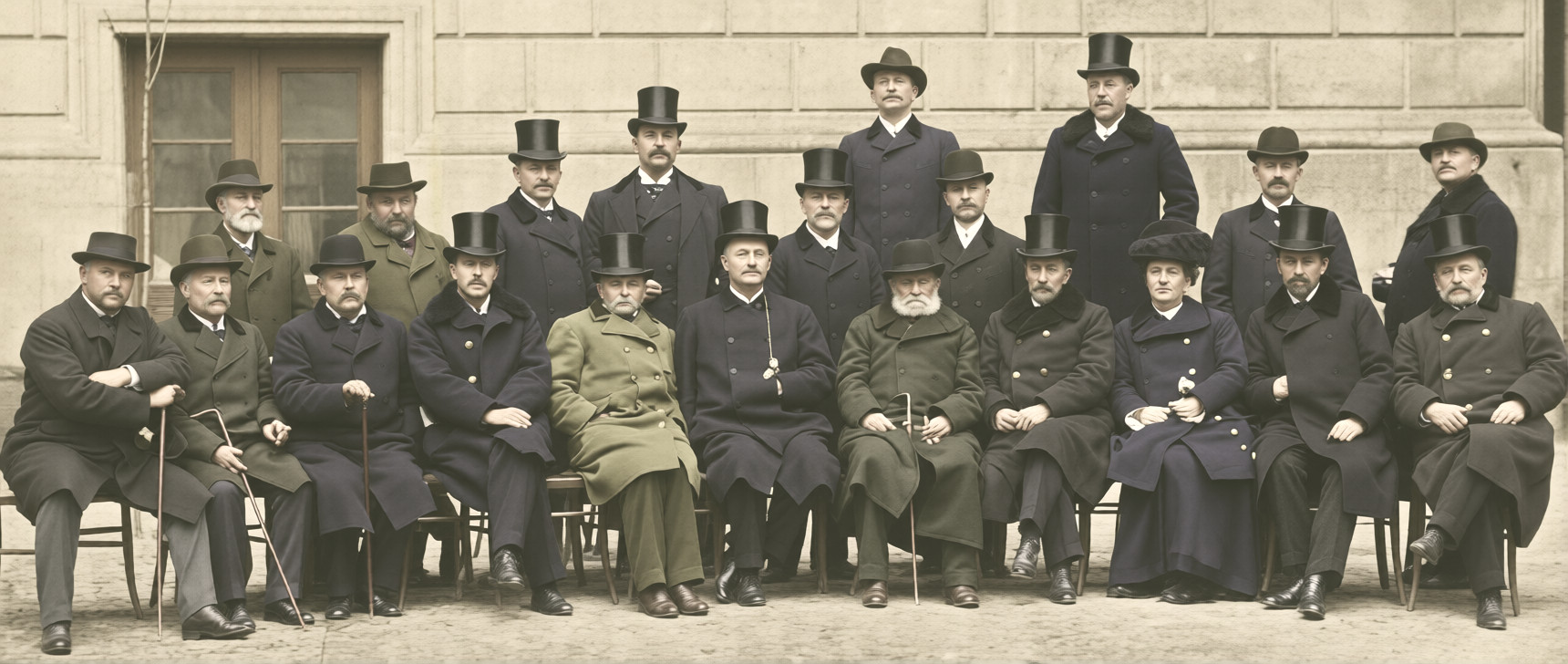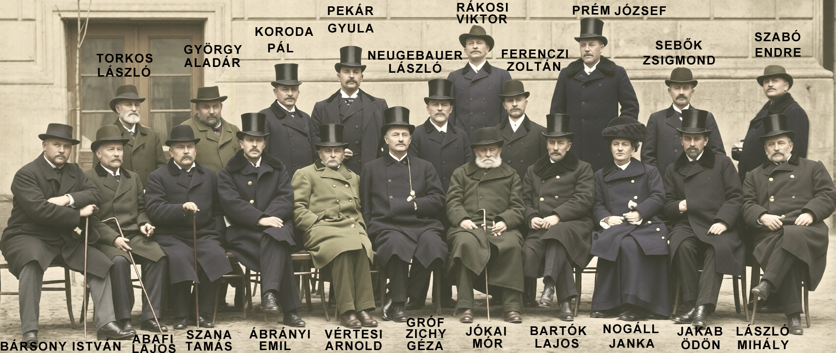 Szabó Endre a kép jobb oldalán a második sorban. Középen Jókai Mór látható Forrás: Vasárnapi Újság 1902