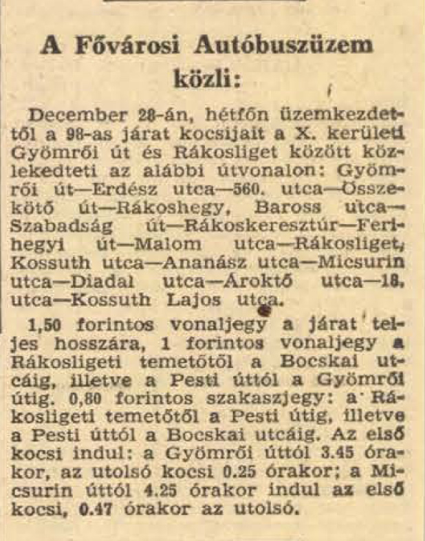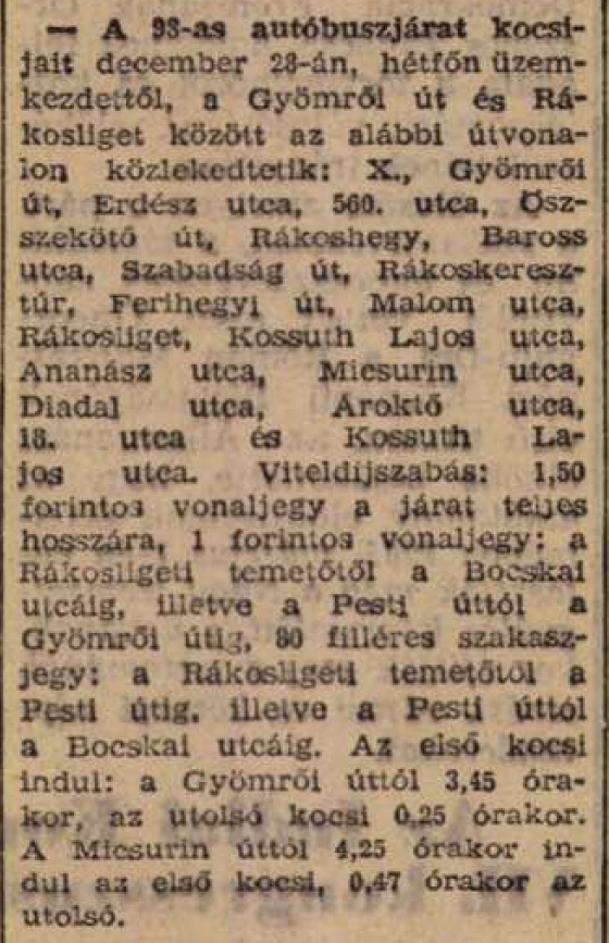 1938-ban a Rákoshegyen működő „Kovács Mihály Autóbusz Vállalat”, amely a Maribuszt is üzemeltette, volt az első, rendszeresen működő autóbuszjárat. Kezdetben Rákoshegy Rákoskeresztúr útvonalon közlekedett, majd ez bővült ki Kőbánya végállomással. A vállalkozás tulajdonában négy jármű volt, és 1938-ban másfél óránként közlekedett. 1945-ben, a háború után egy busszal kezdte meg működést, és 1950-re már újra három jármű állt az utazóközönség rendelkezésére.