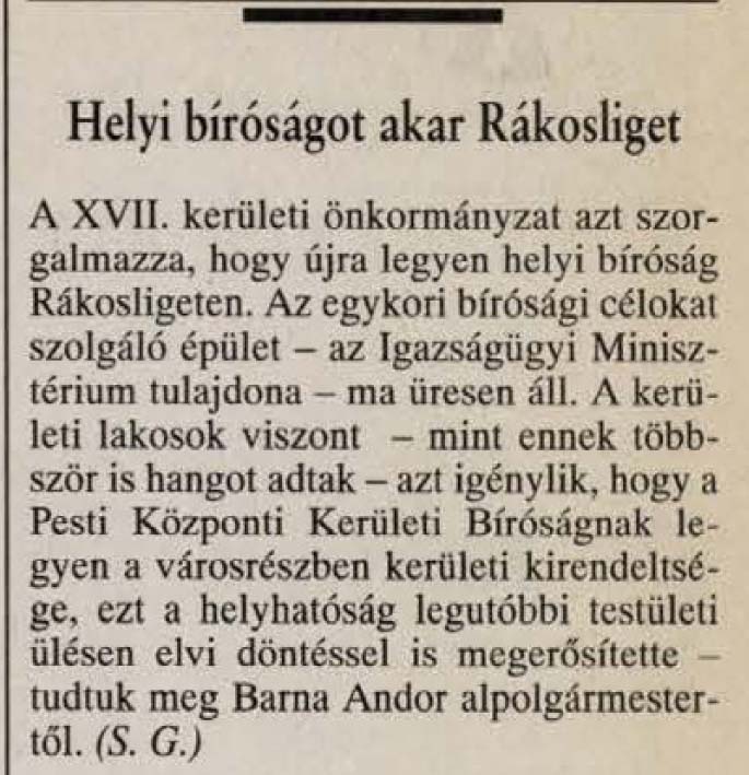 … A javaslat megtételét áz is indokolja, hogy mindkét bíróság épülete igen rossz állapotban van, rendbehozatalatuk,felújításuk jelentős pénzösszegekbe kerülne. A Pesti Központi Kerületi Bíróság felújításának ez évben történő befejezésekor lehetőség nyílik az épületben a XVII. kerületi Bíróság elhelyezésére. …