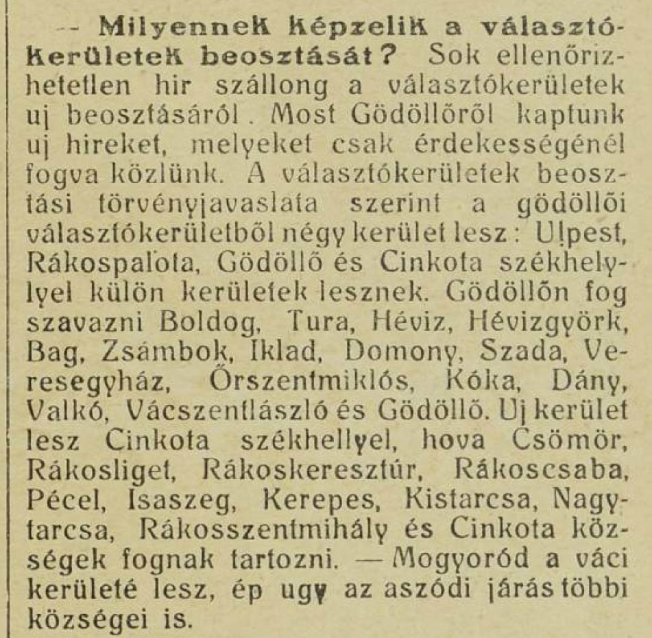 A m. kir. belügyminiszter úr a Pest-Pilis-Solt-Kiskun vármegyébe kebelezett Cinkota, Rákosliget, Rákoscsaba és Rákoskeresztúr községeknek a gödöllői járásból a központi járásba való átcsatolását jóváhagyta. Az átcsatolás időpontja 1936. évi május hó 1. napjában állapíttatott meg. Budapest, 1936. évi február hó 10-én.
