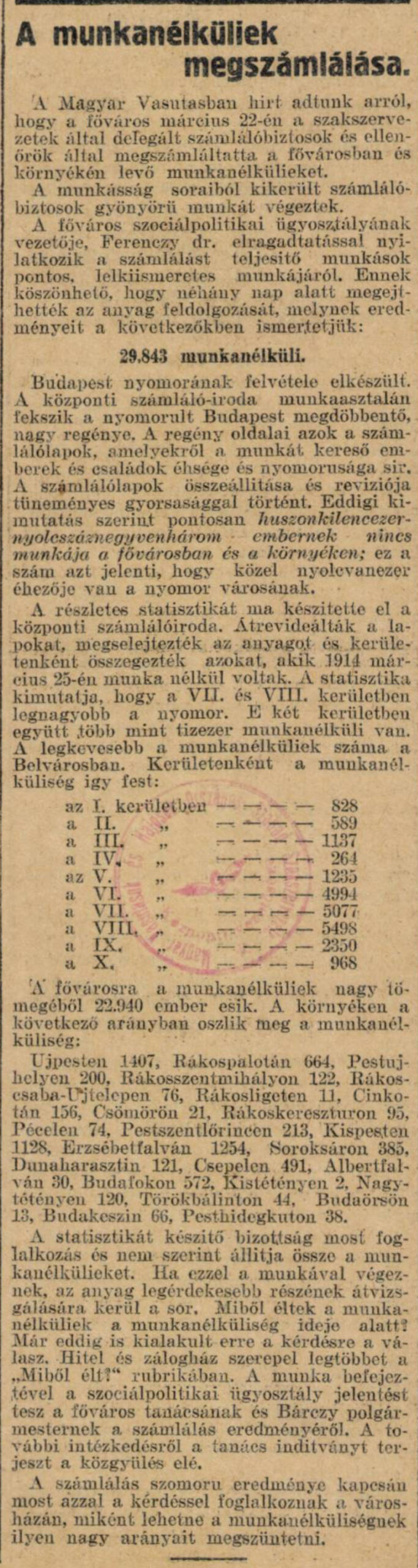 1914. április 20. Munkanélküliség felmérése