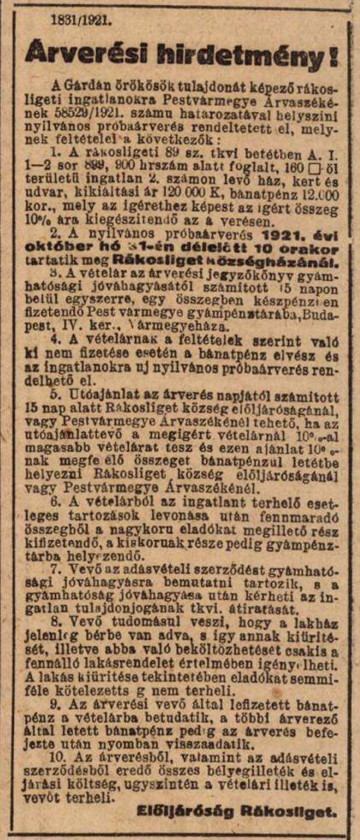 1921. október 27. Árvaszék árverés.