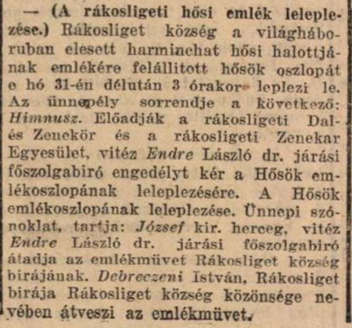 1925. május 20. I. világháborús emlékmű felavatása.