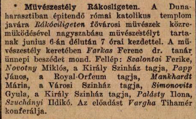 1926. június 6. Művészestély a dunaharaszti templomépítés javára.