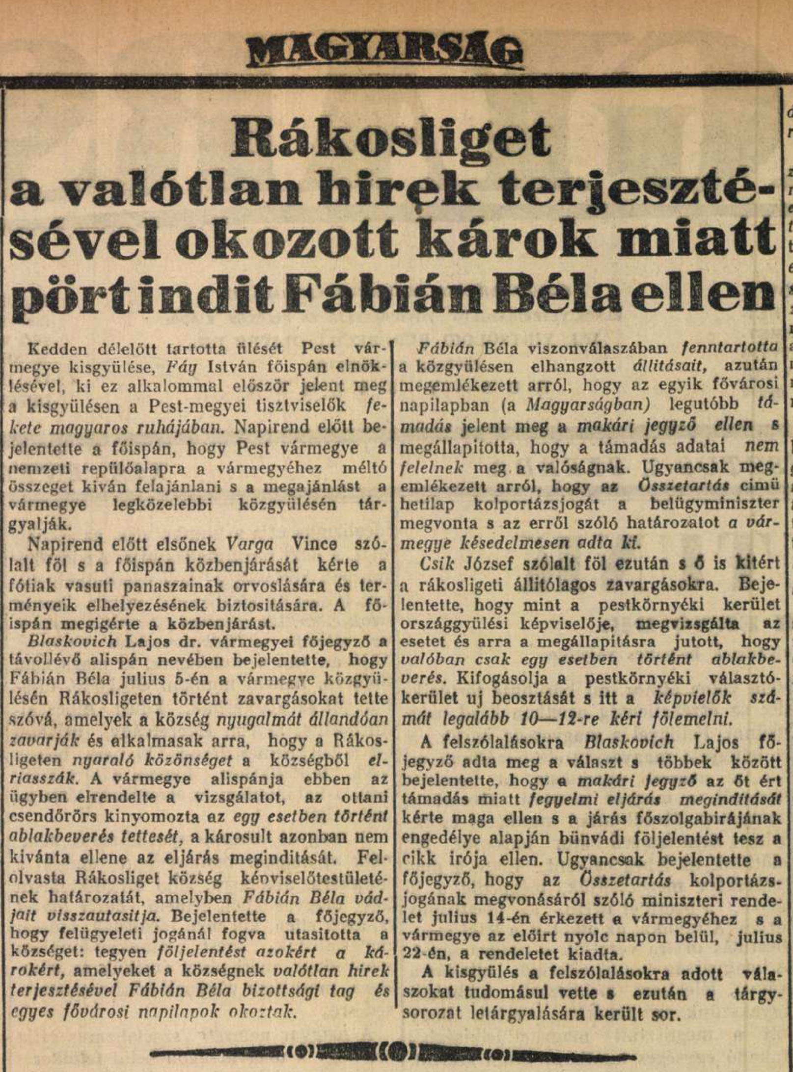 1938. augusztus 3. Per Fábián Béla képviselő ellen.