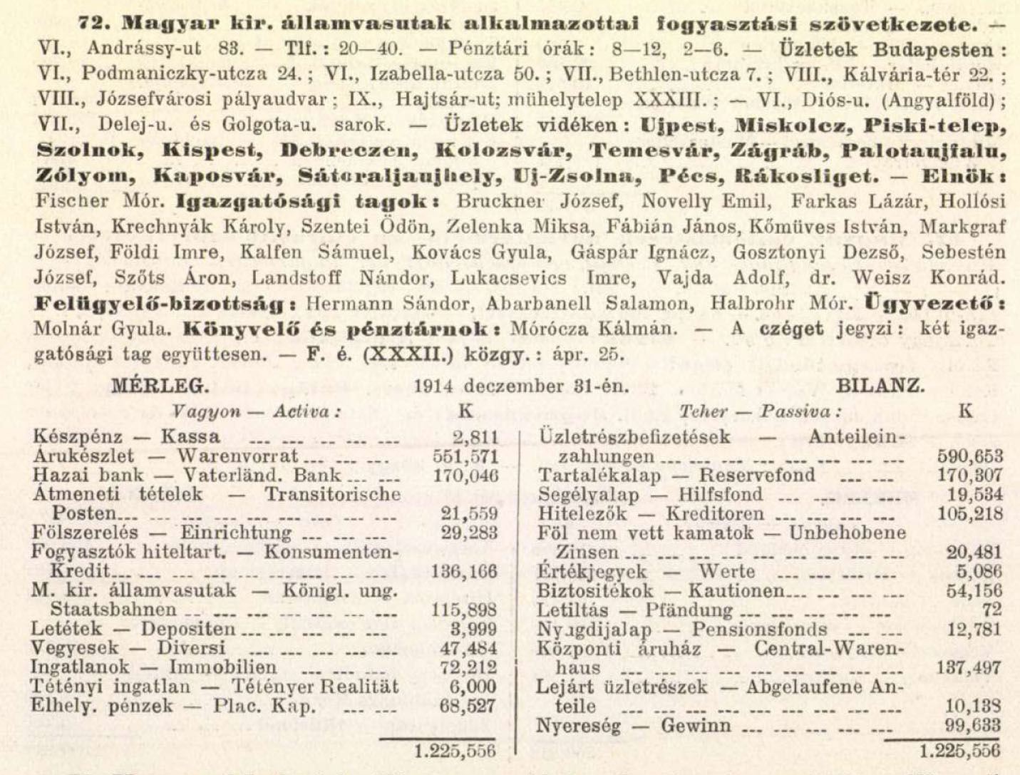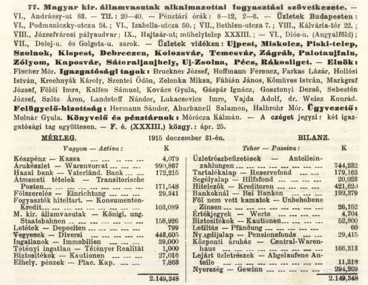 MÁV alkalmazottak Fogyasztási Szövetkezete 1912 MÁV alkalmazottak Fogyasztási Szövetkezete Forrás: Magyar Compass 1912 1914 Forrás: Magyar Compass 1914 1915 Forrás: Magyar Compass 1915 1916 Forrás: Magyar Compass 1916