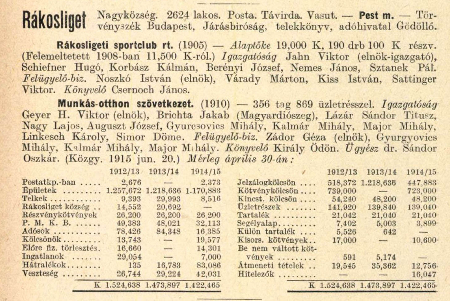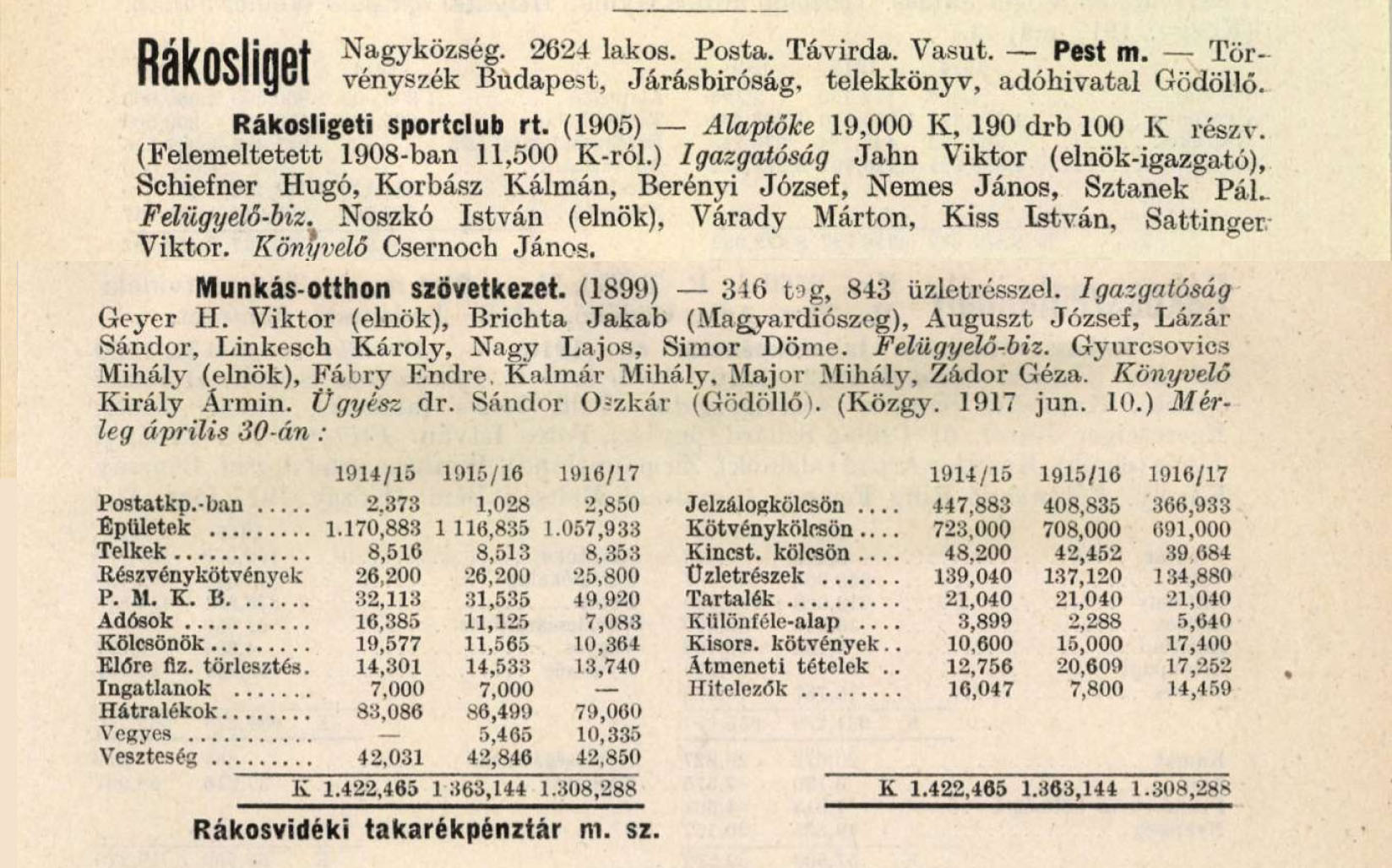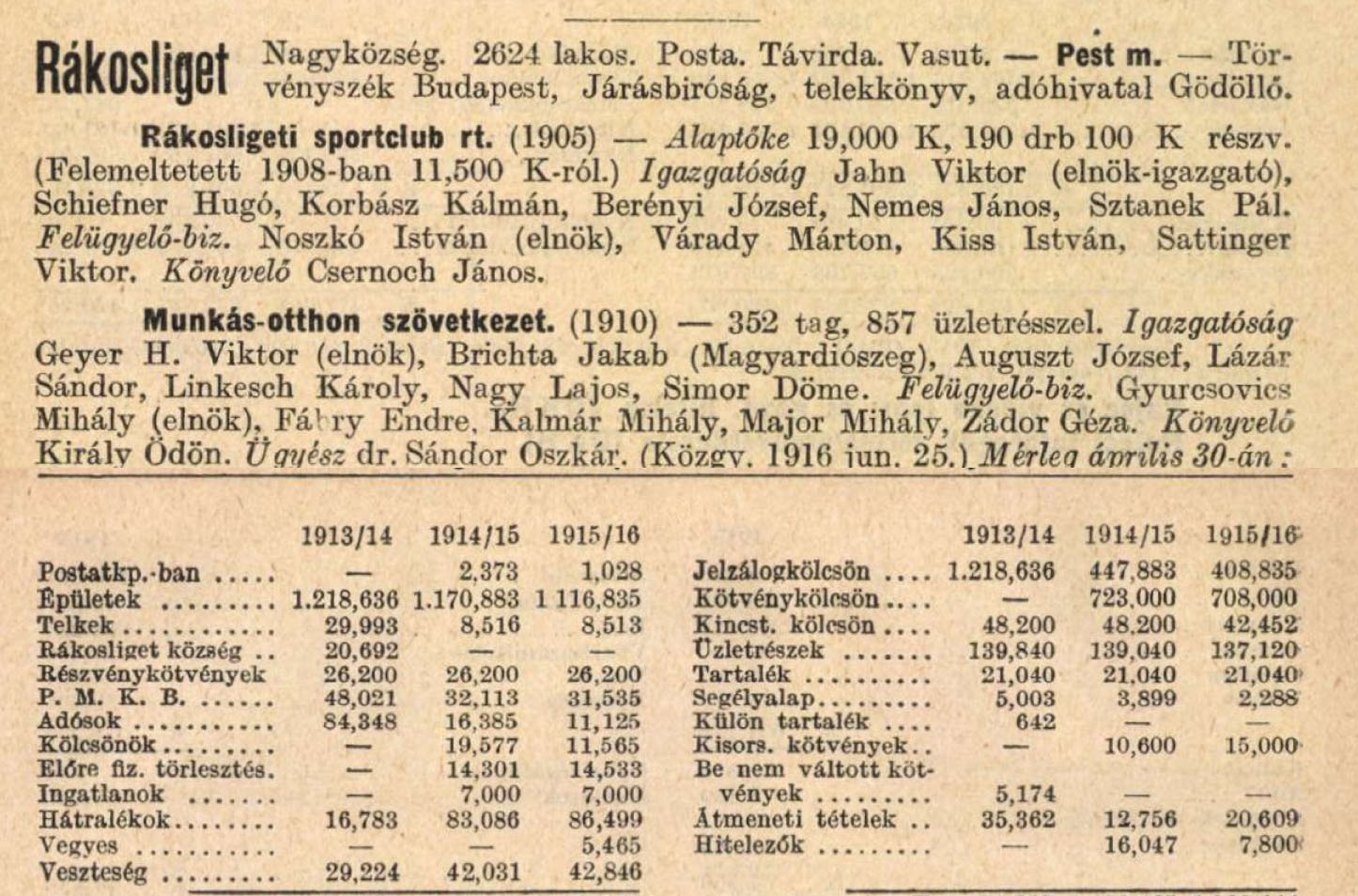 Egészen más jelentőségű, de a közgazdasági történet szempontjából majdnem oly fontos volt az a szociális alkotás, mely a bank kölcsönével Rákosliget község kifejlesztésére vezetett, még pedig azon az alapon, hogy az 1898-ban alakult Munkás-otthon szövetkezet alapításában a banknak jelentékeny része volt. Az általa első helyen nyújtott jelzálogkölcsönökkel, továbbá a kincstár és a Hollandi életbiztosító társaság, valamint néhány gyárvállalat által átvett másodhelyű kötvénykölcsön segélyével biztosította, hogy a Szövetkezet, tagjai részére, a főváros közelében, Rákoskeresztúr község mellett Munkás és tisztviselő-telepet létesítsen. Ebből a 400 házzal épült telepből fejlődött ki a mai virágzó Rákosliget község.