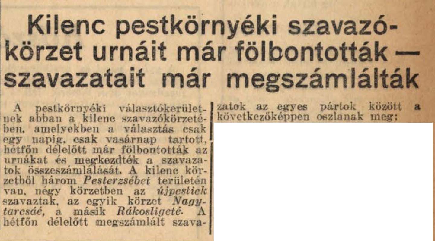 Itt látszik csak meg igazán, hogy mi a különbség a titkos és a nyílt szavazás között. Ahogy járjuk sorra a községeket, ahol titkos lesz a szavazás. Rákoskeresztúrt, Rákoscsabát. Rákosligetet és Rákoshegyet, tehát a gödöllői híres járás községeit, azokat, ahol Endre László a főszolgabíró, sehol sem hallunk panaszt. Itt nem tudnak közigazgatási terrorról beszélni. Mondják ugyan, hogy a bírák, a jegyzők gyűjtöttek az egységespárt részére ajánlásokat: