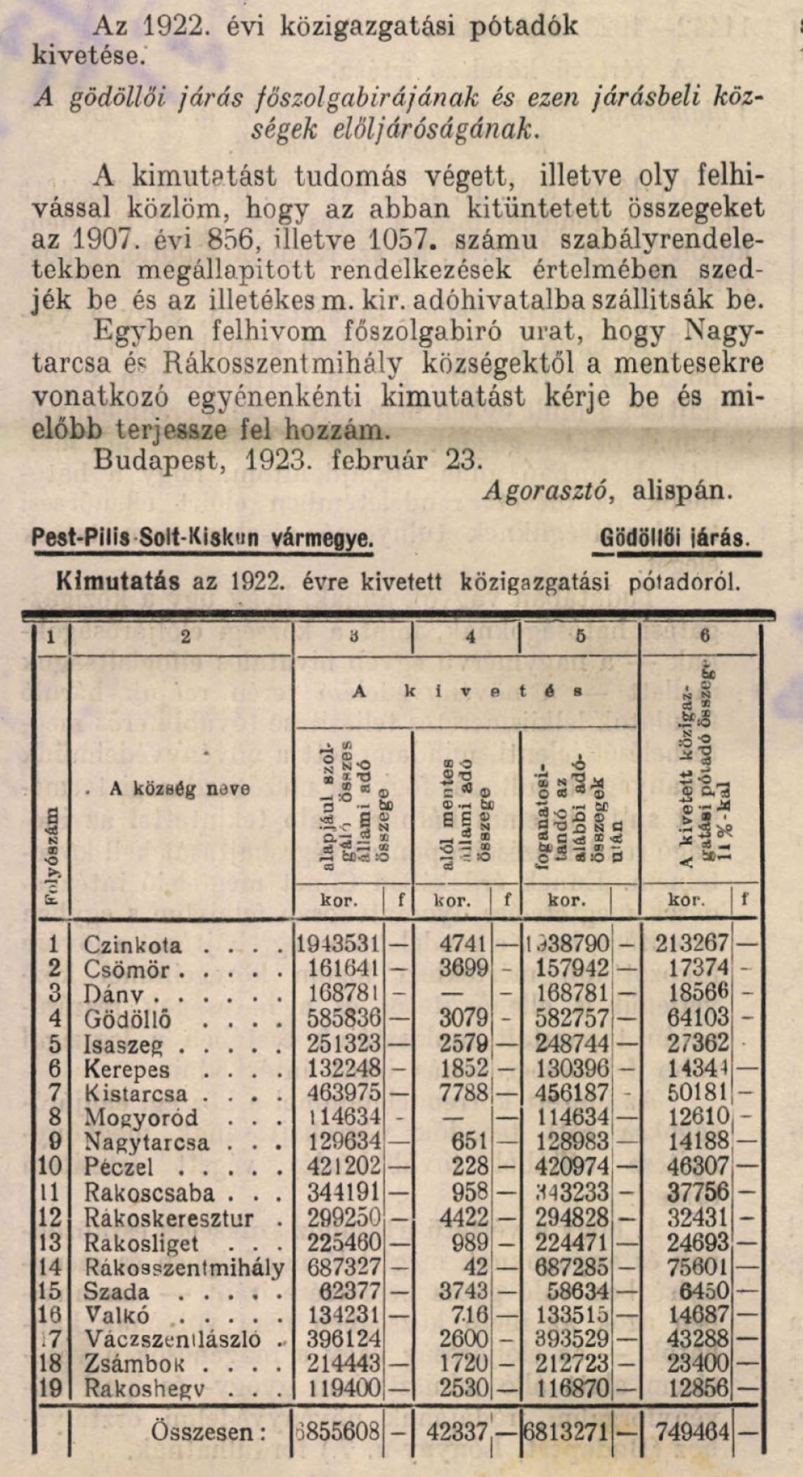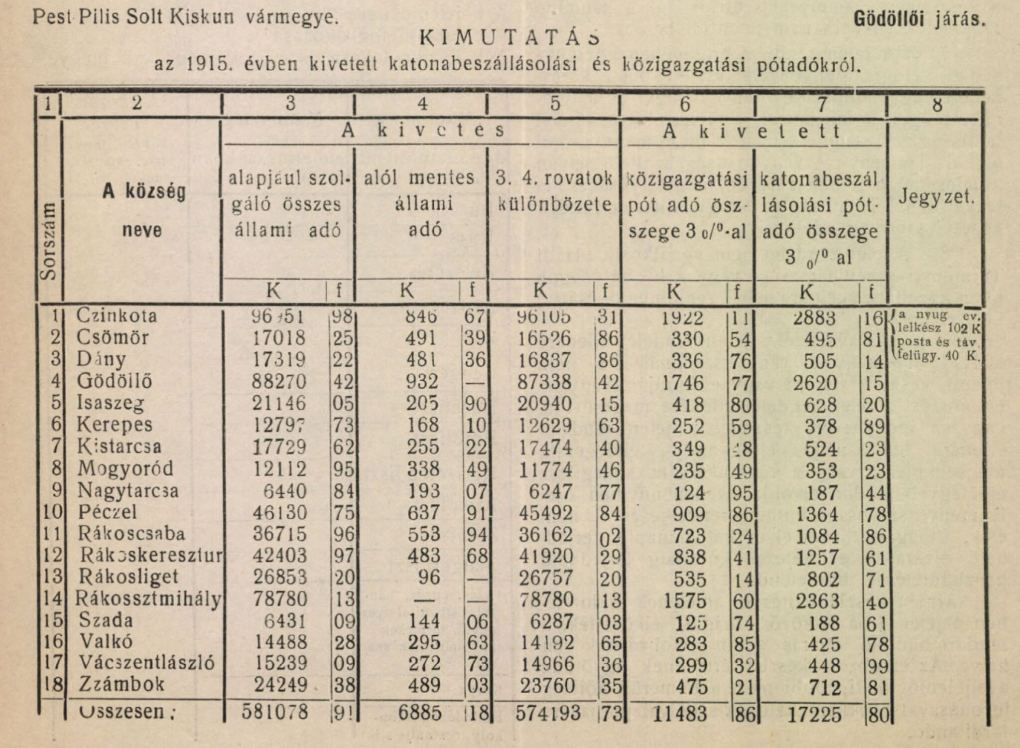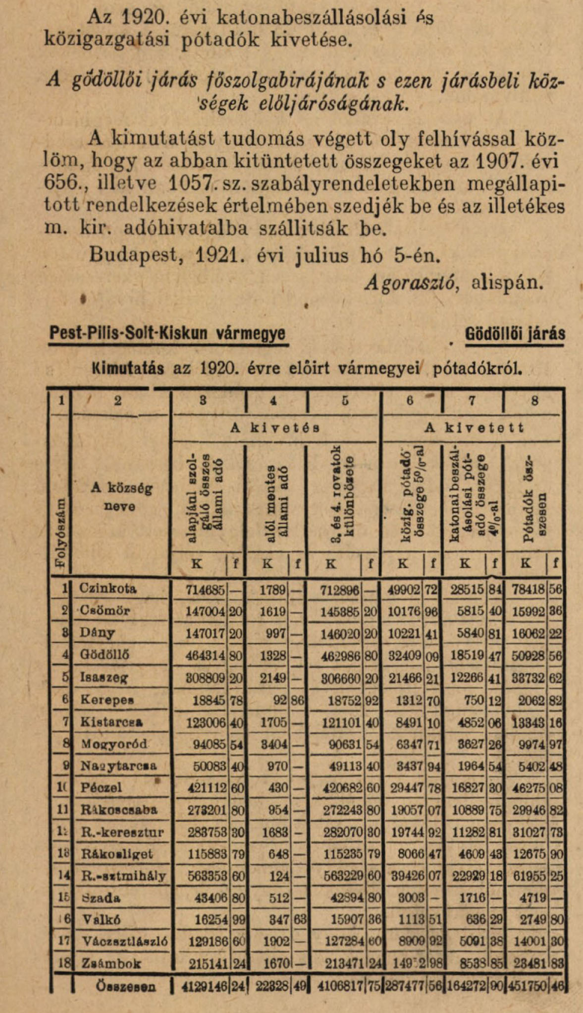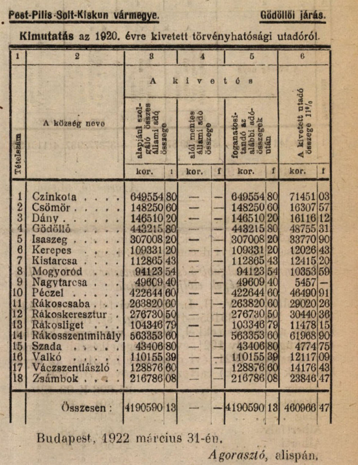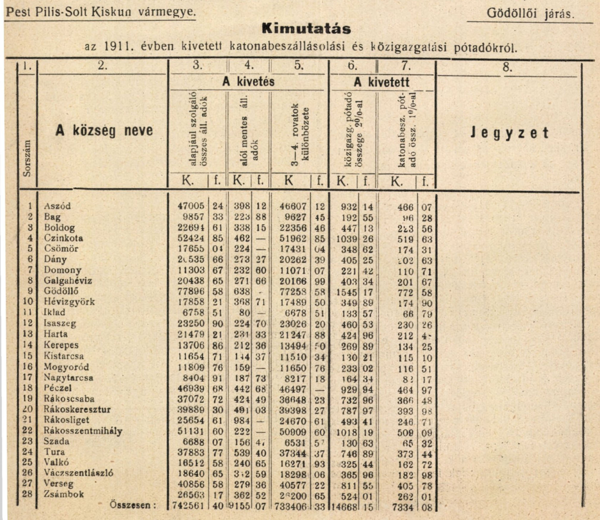 A kimutatást tudomás végett oly felhívással közlöm, hogy az abban kitüntetett összegeket az 1907. évi 856., illetve 1057. sz. szabályrendeletekben megállapított rendelkezések értelmében szedjék be, és a gödöllői m. kir. adóhivatalba szállítsák be.