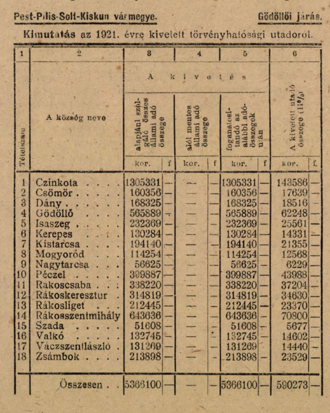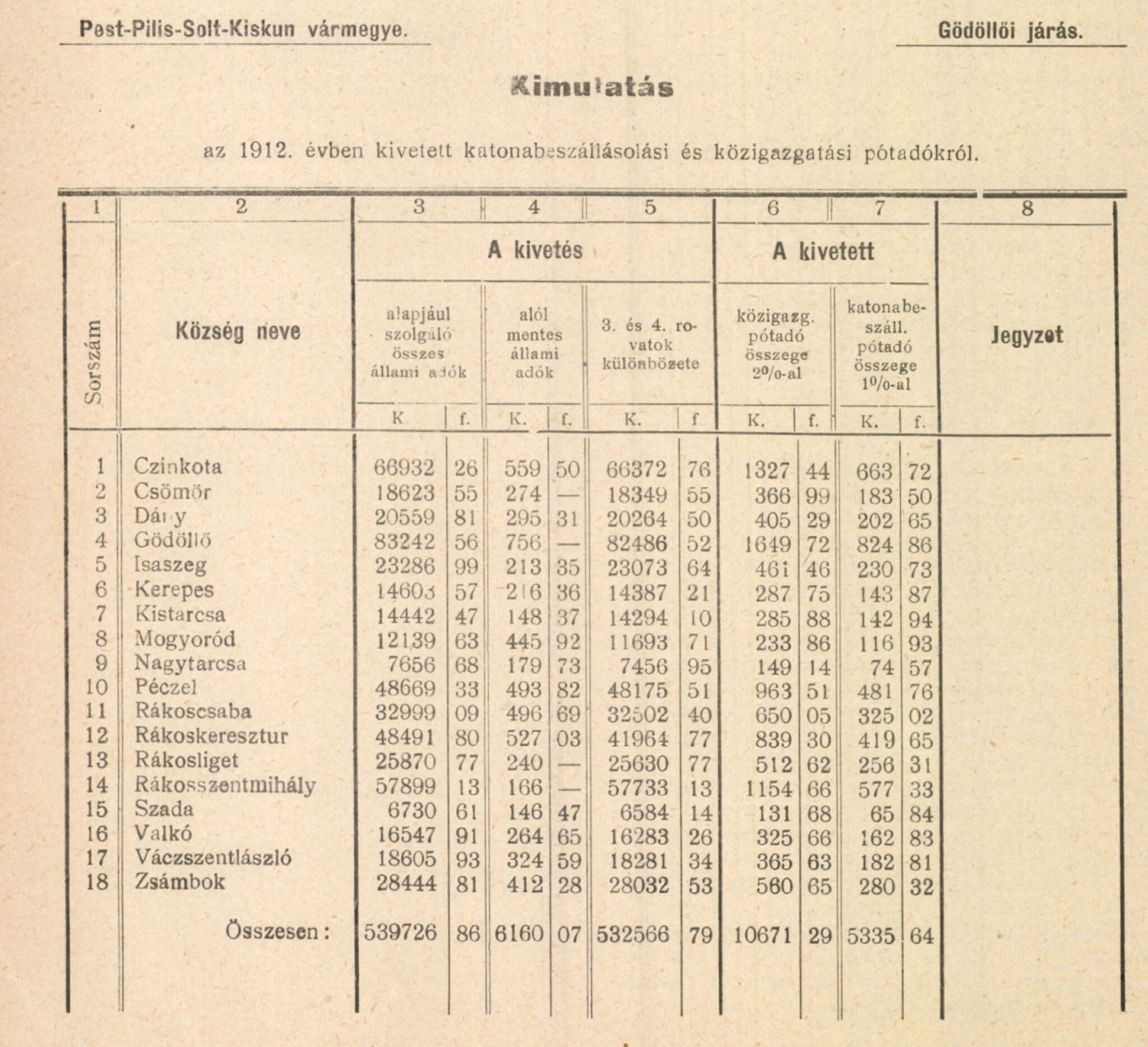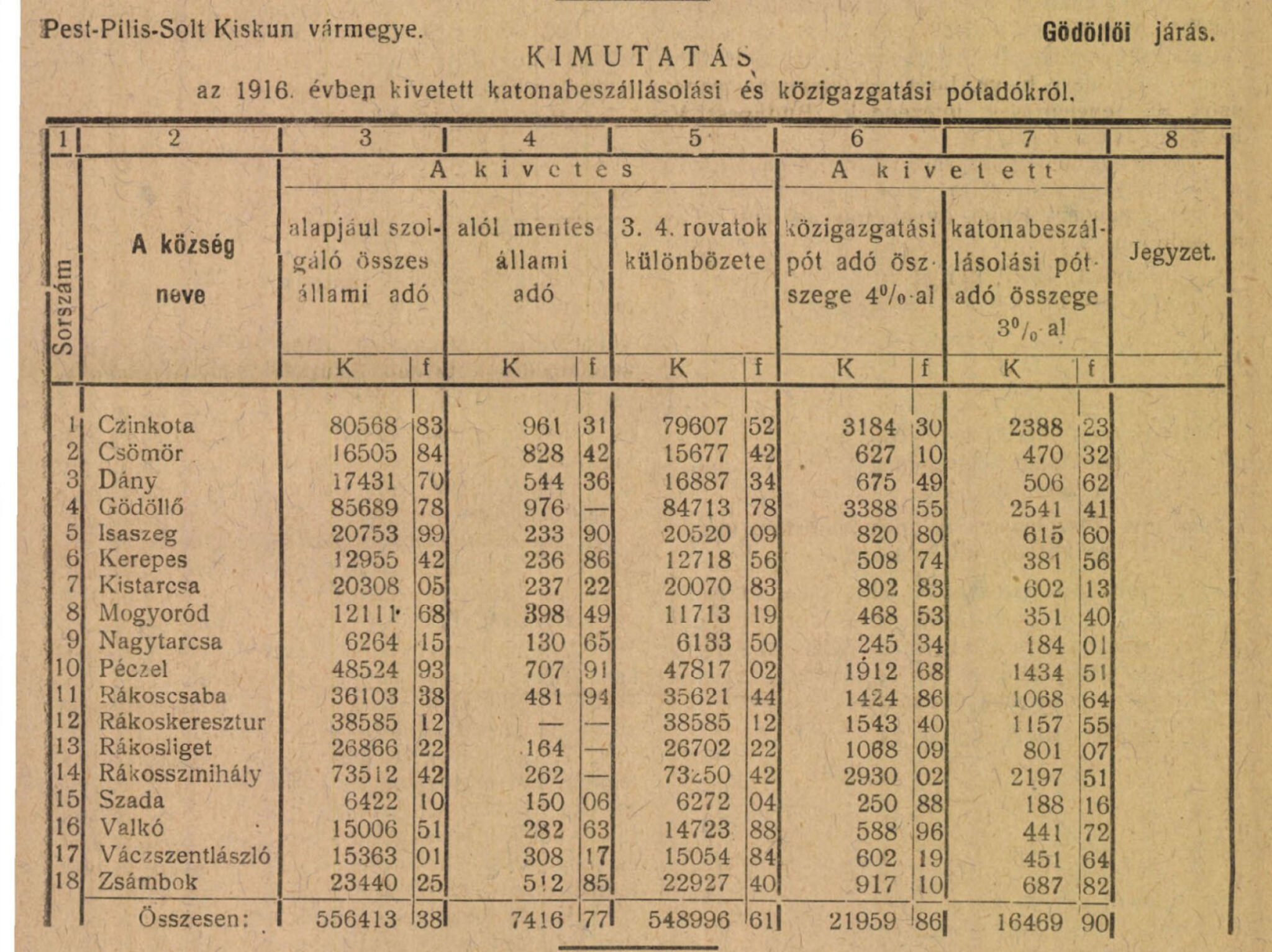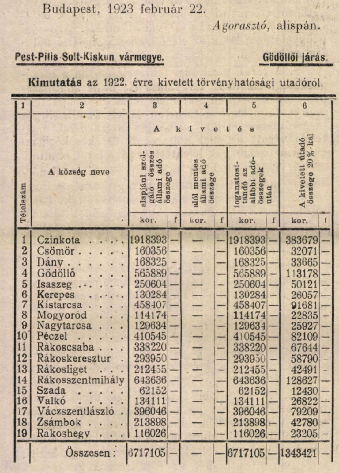 A kimutatást tudomás végett oly felhívással közlöm, hogy az abban kitüntetett összegeket az 1907. évi 856., illetve 1057. sz. szabályrendeletekben megállapított rendelkezések értelmében szedjék be, és a gödöllői m. kir. adóhivatalba szállítsák be.