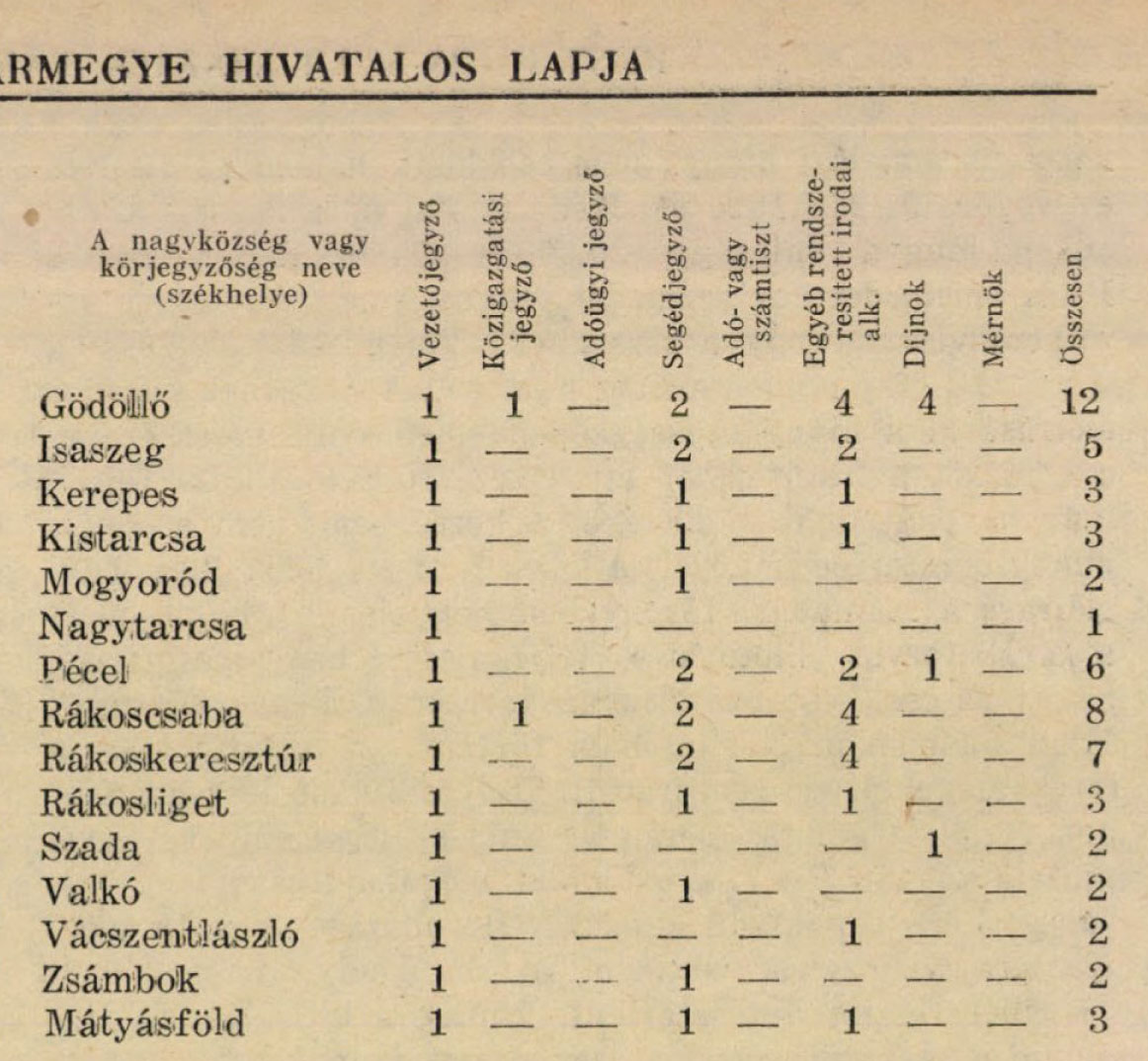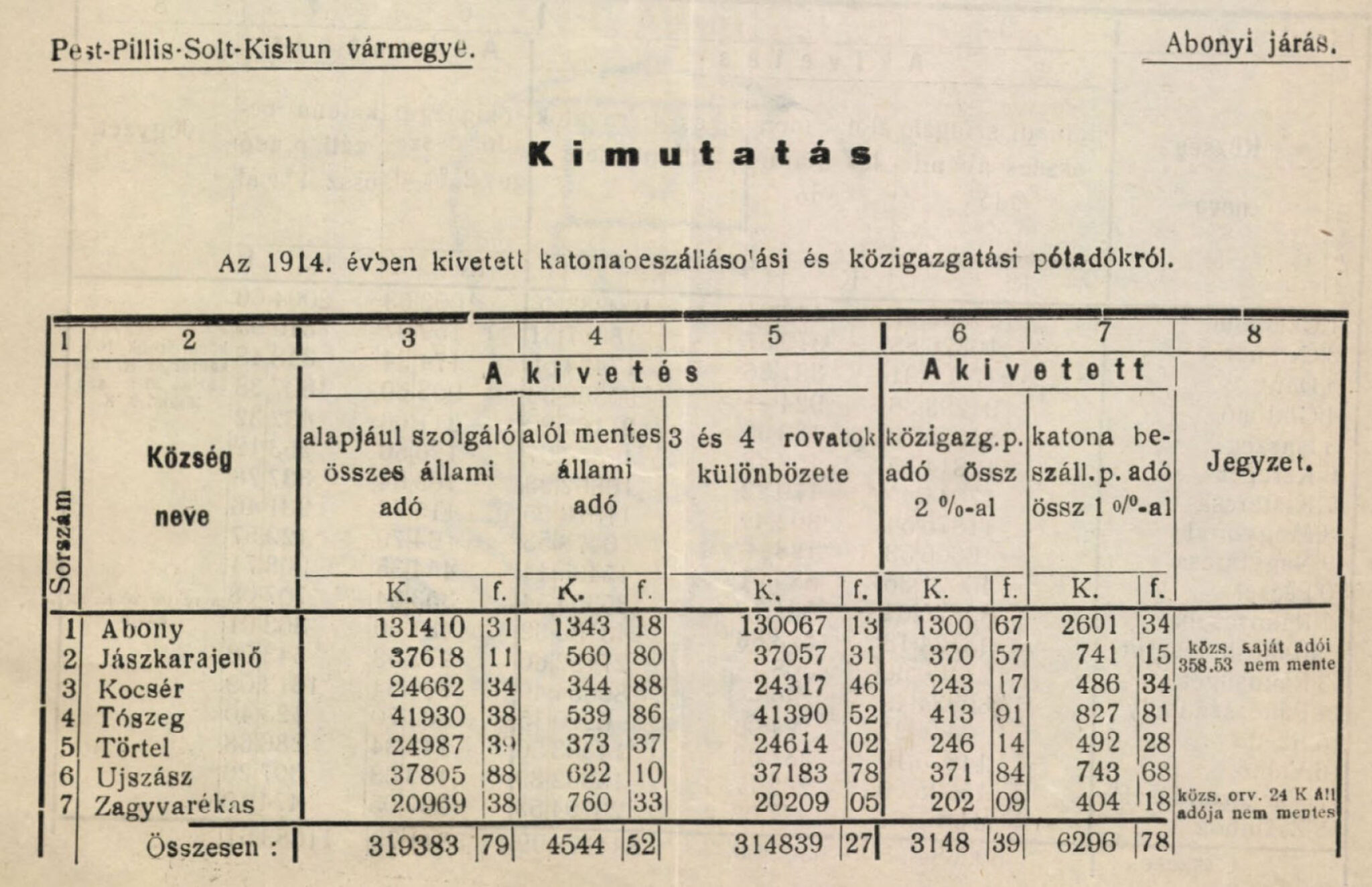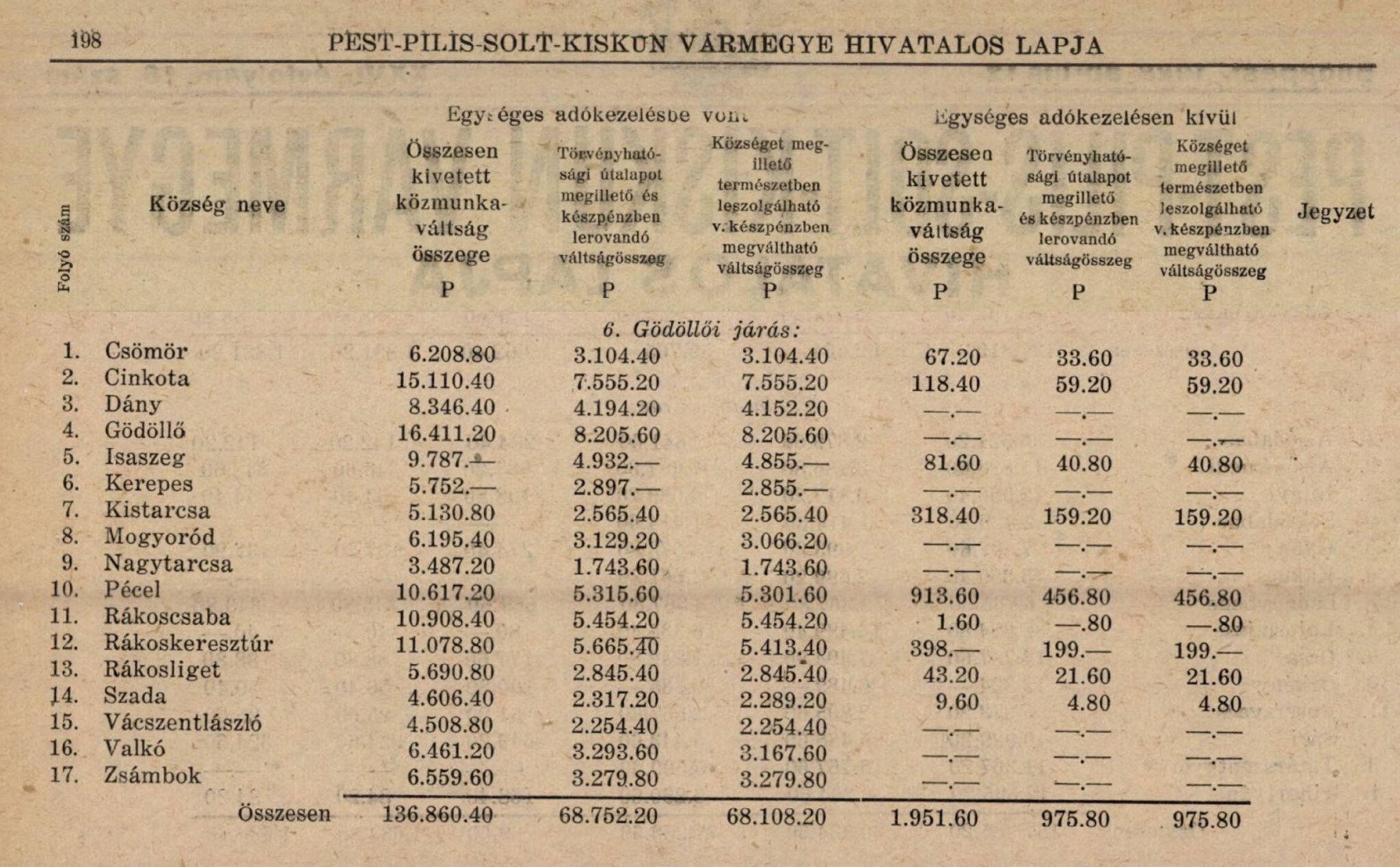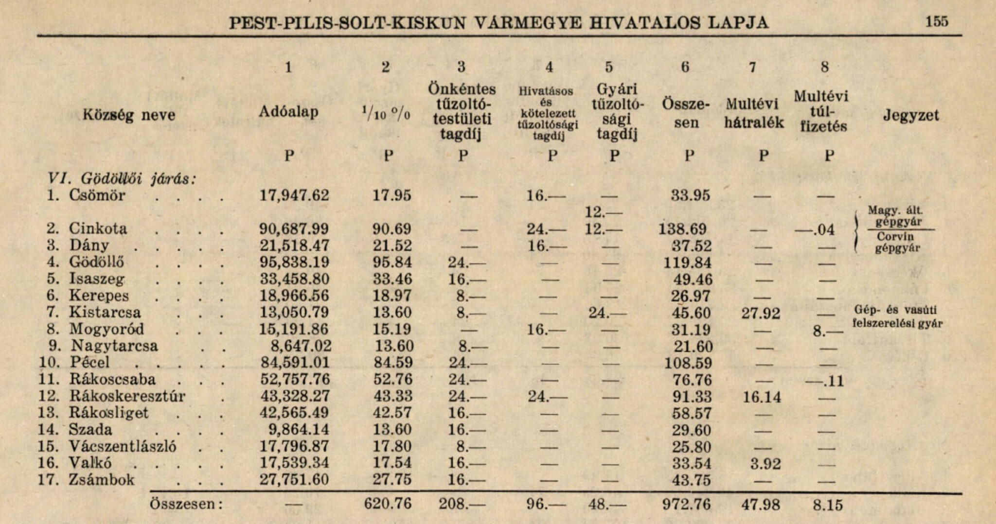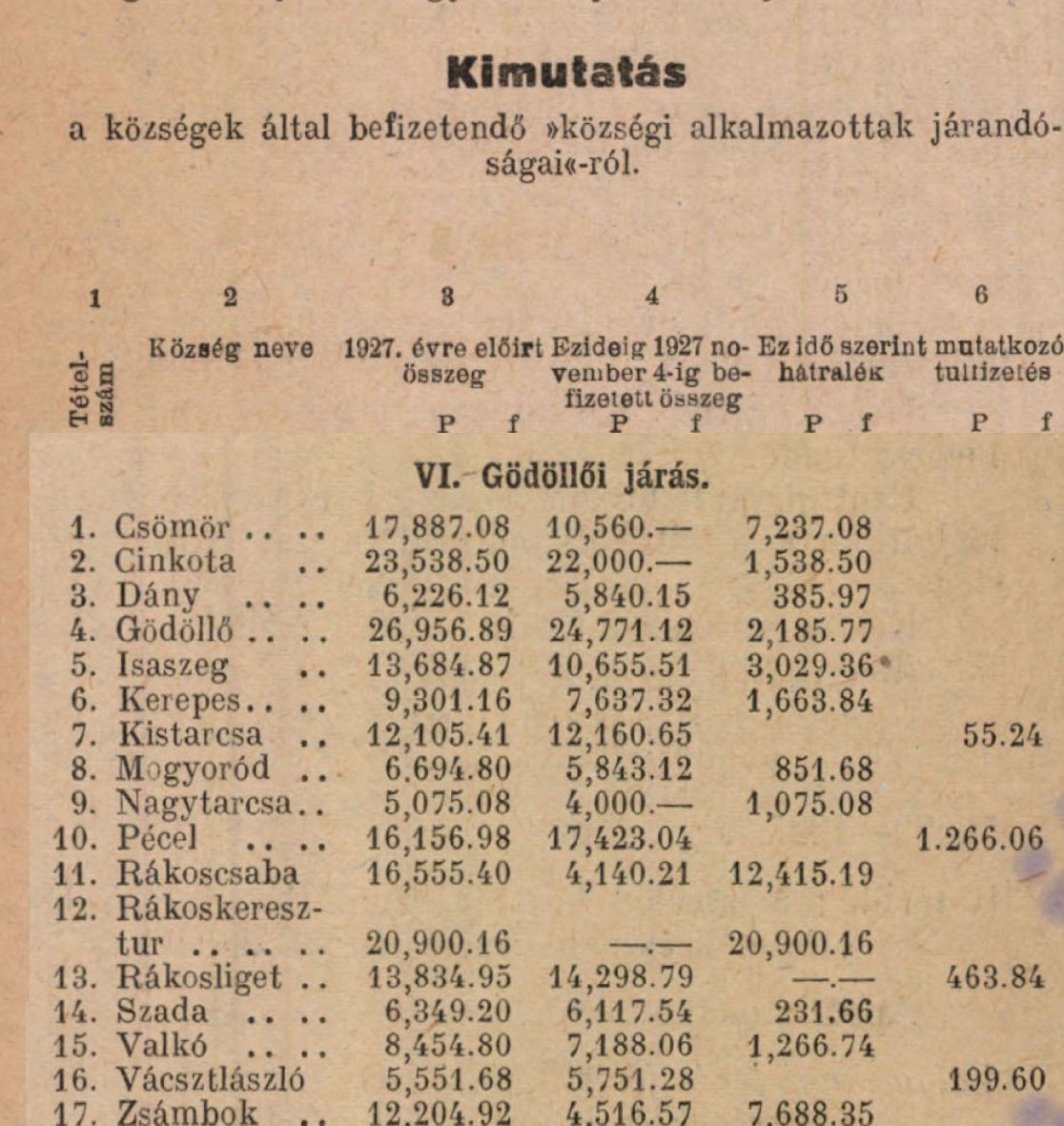 A kimutatást tudomás végett oly felhívással közlöm, hogy az abban kitüntetett összegeket az 1907. évi 856., illetve 1057. sz. szabályrendeletekben megállapított rendelkezések értelmében szedjék be, és a gödöllői m. kir. adóhivatalba szállítsák be.