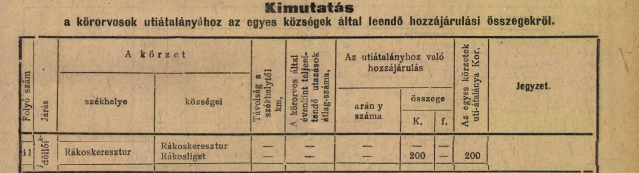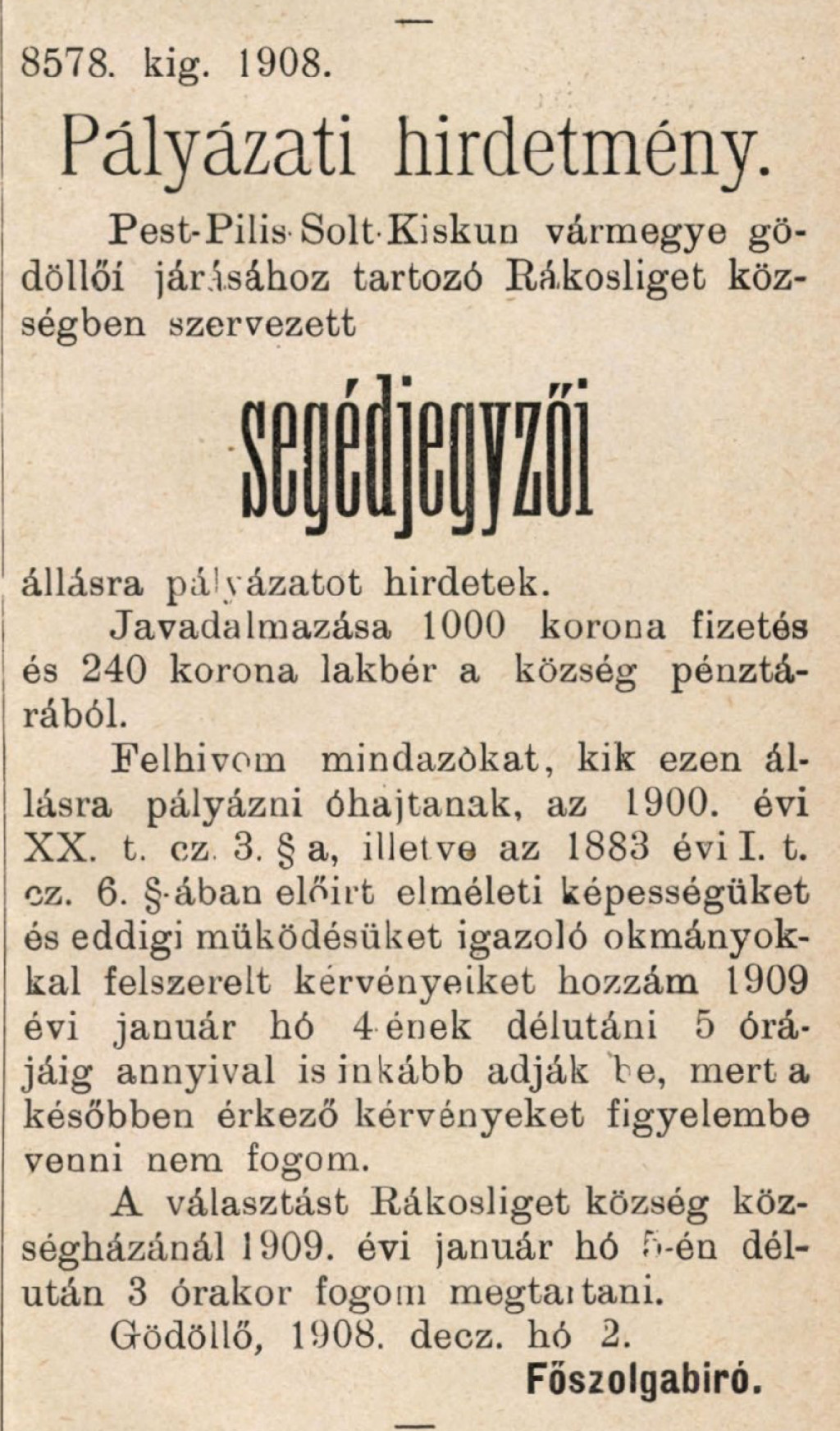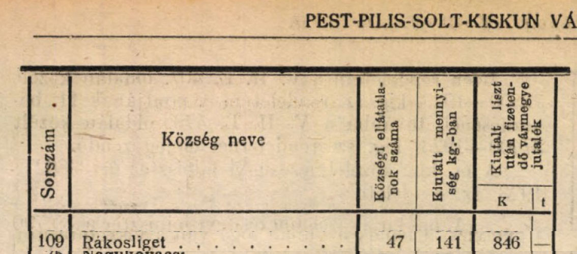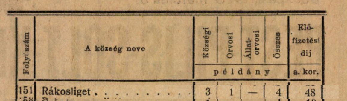Tudomásvétel végett közlöm, …hogy a kereskedelemügyi miniszter ur 10430/908. számú rendeletével megengedte, hogy Rákosliget községben minden hét hétfő és csütörtöki napjain állatfelhajtás és helypénzszedés nélküli hetivásár tartassák.