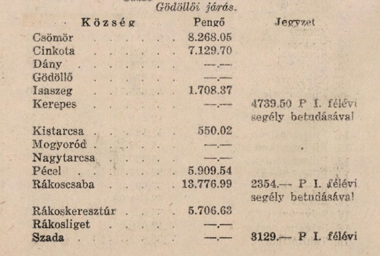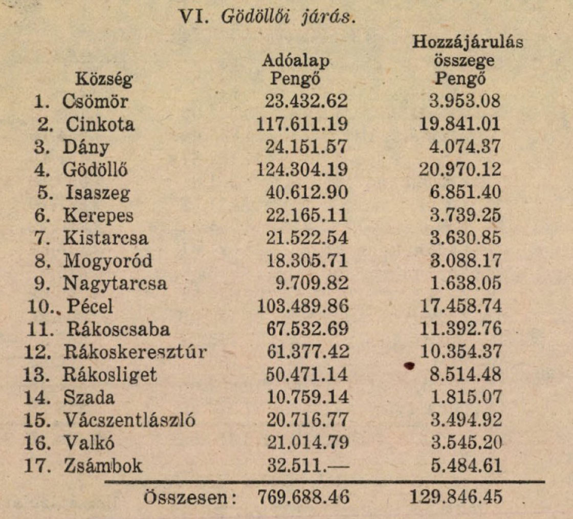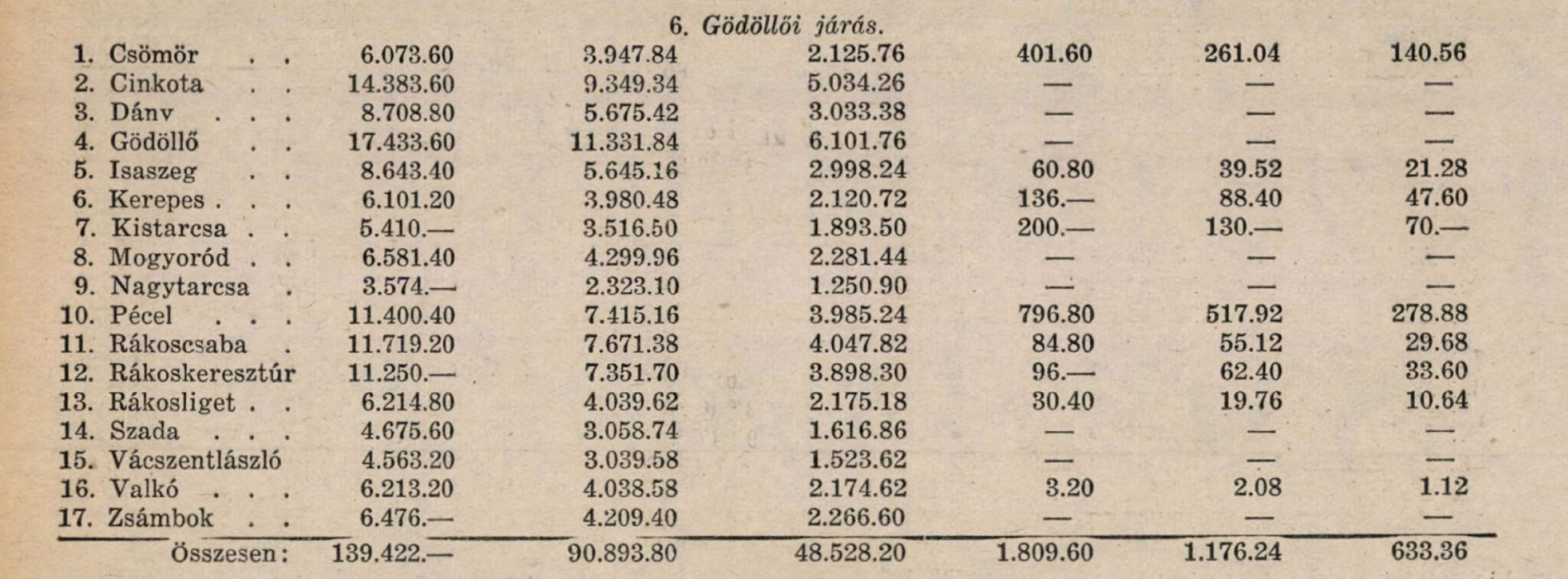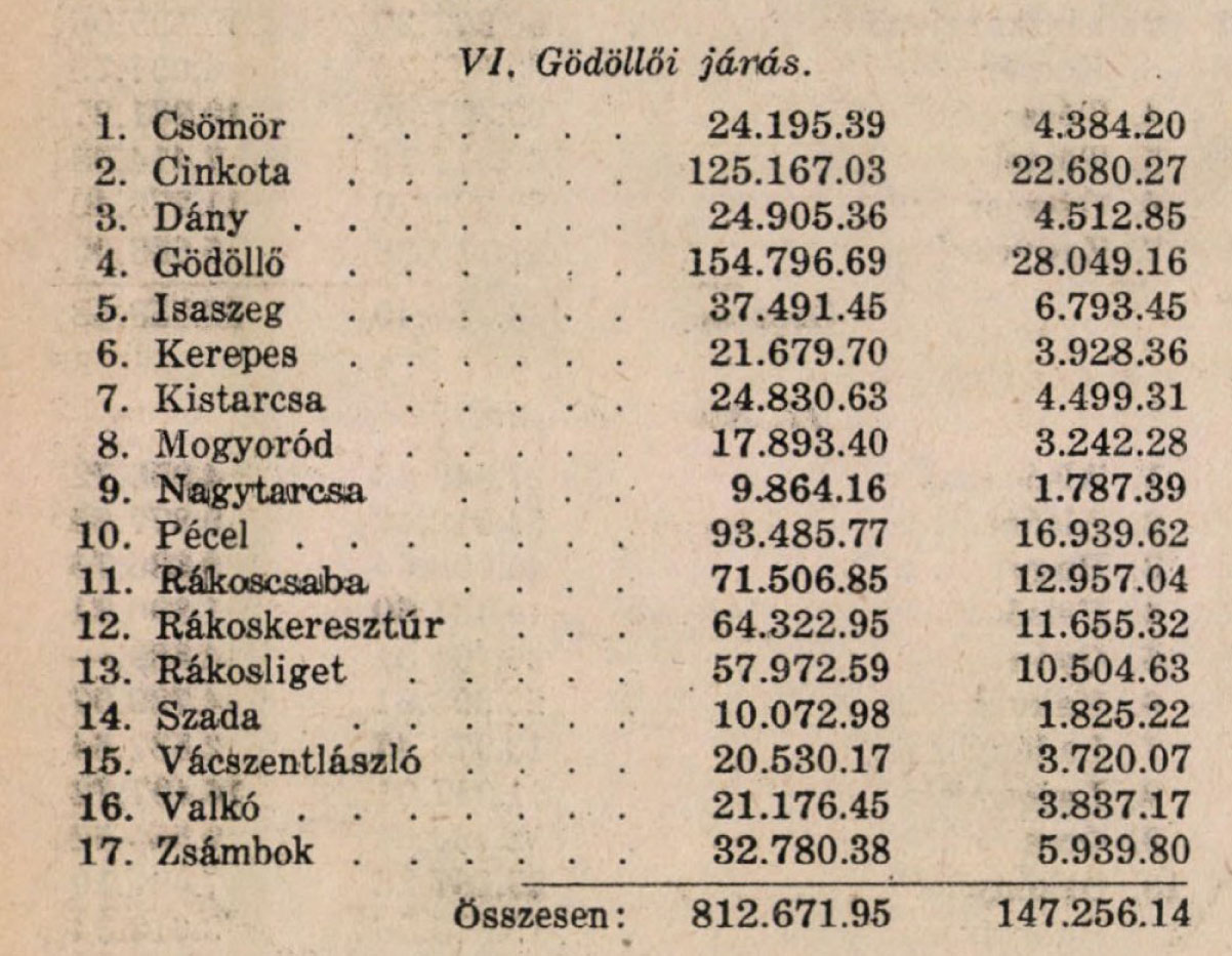 XIV. Gödöllői járásban. Aszód 3880.98, Bag 1647.20, Boldog 2745.22, Csömör 2241.25, Czinkota 4552.99, Dány 2825.17, Domony 1277.06, Galgahéviz 2084.57, Gödöllő 10816.98, Hévizgyörk 1534.94, Iklad 994.74, Isaszeg 2730.13, Kartal 3099.10, Kerepes 1092.52, Kistarcsa 691.18, Mogyoród 1914.01, Nagytarcsa 974.07, Péczel 4466.31, Rákoscsaba 3811.25, Rákoskeresztúr 6065.11, Rákosliget 1735.53, Rákosszentmihály 5214.68, Szada 1245.44, Túra 6484.19, Valkó 1849.59, Váczszentlászló 1396.91, Verseg 4614.20, Zsámbok 3483.56, összesen: 85468 kor. 94 fill.
