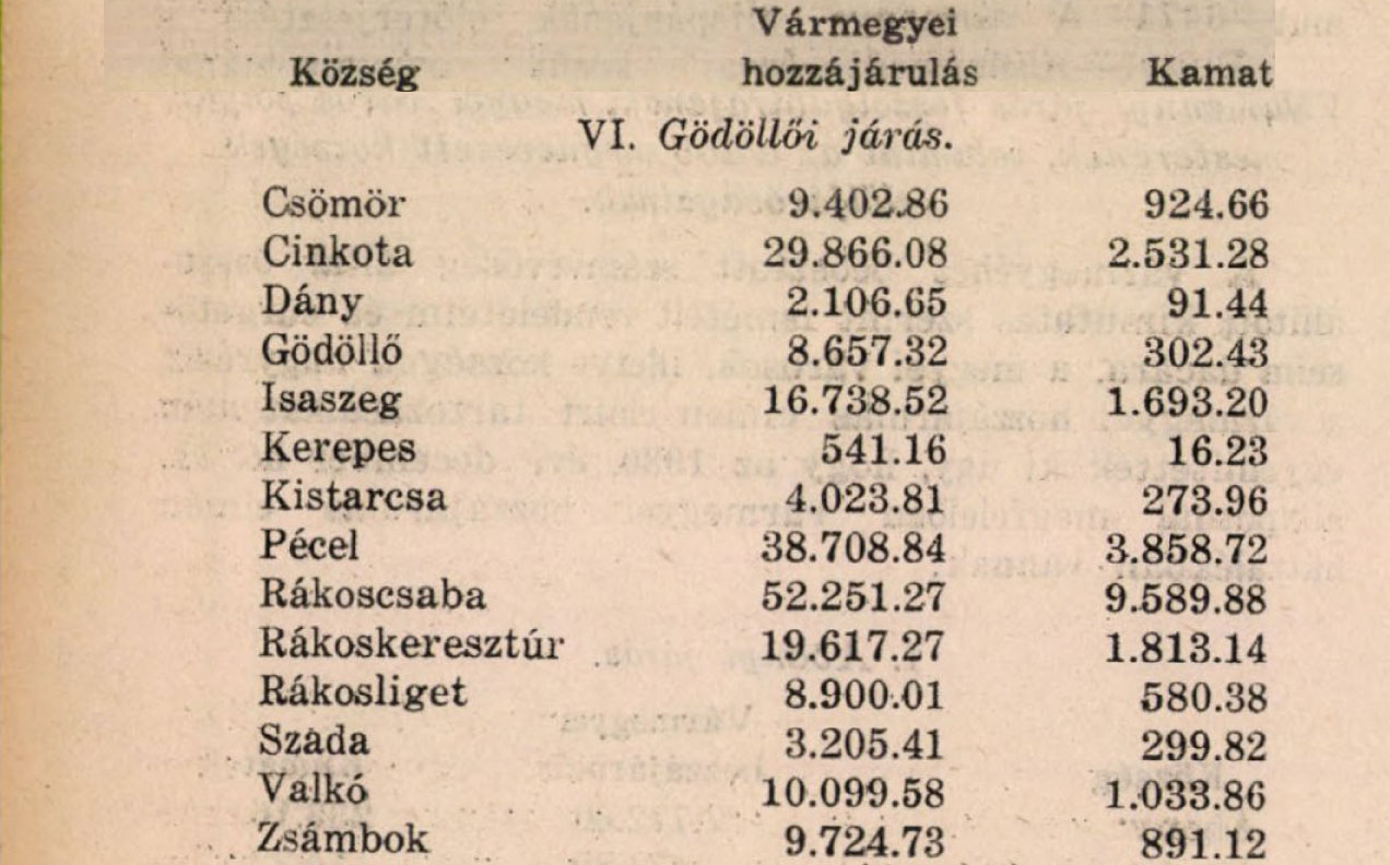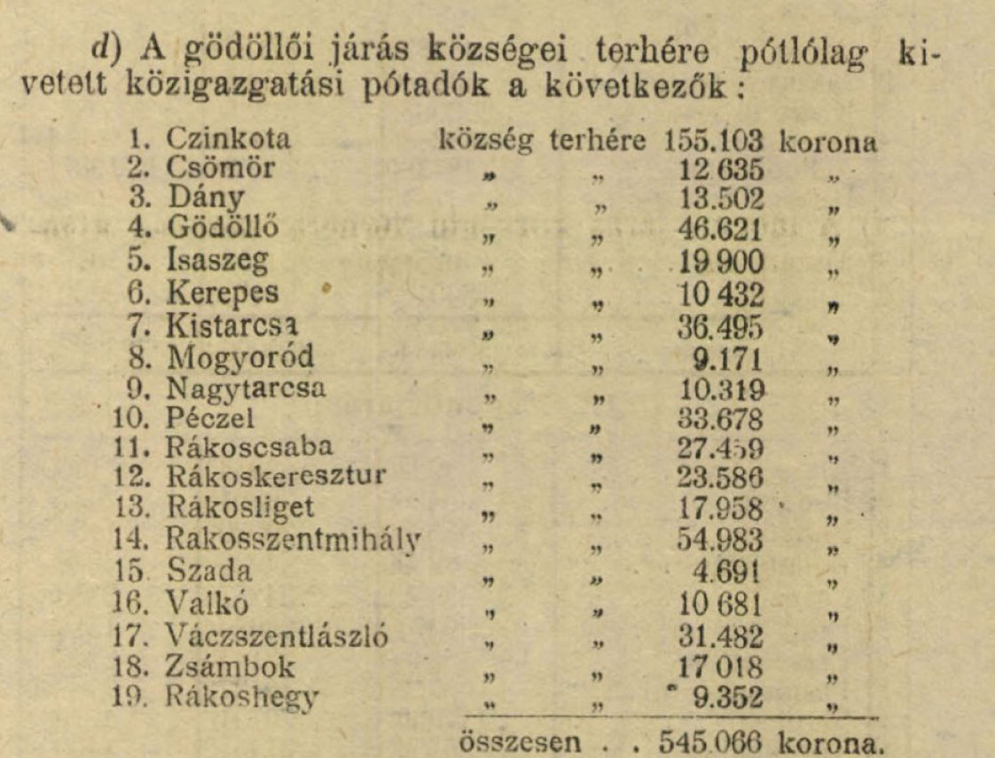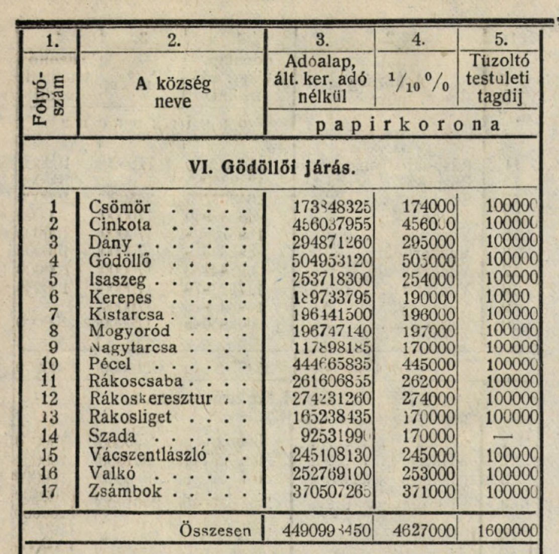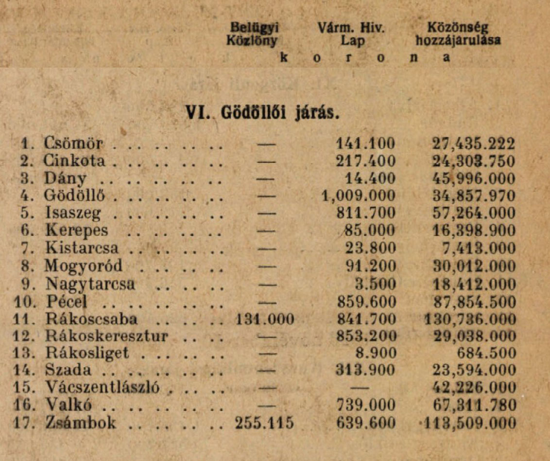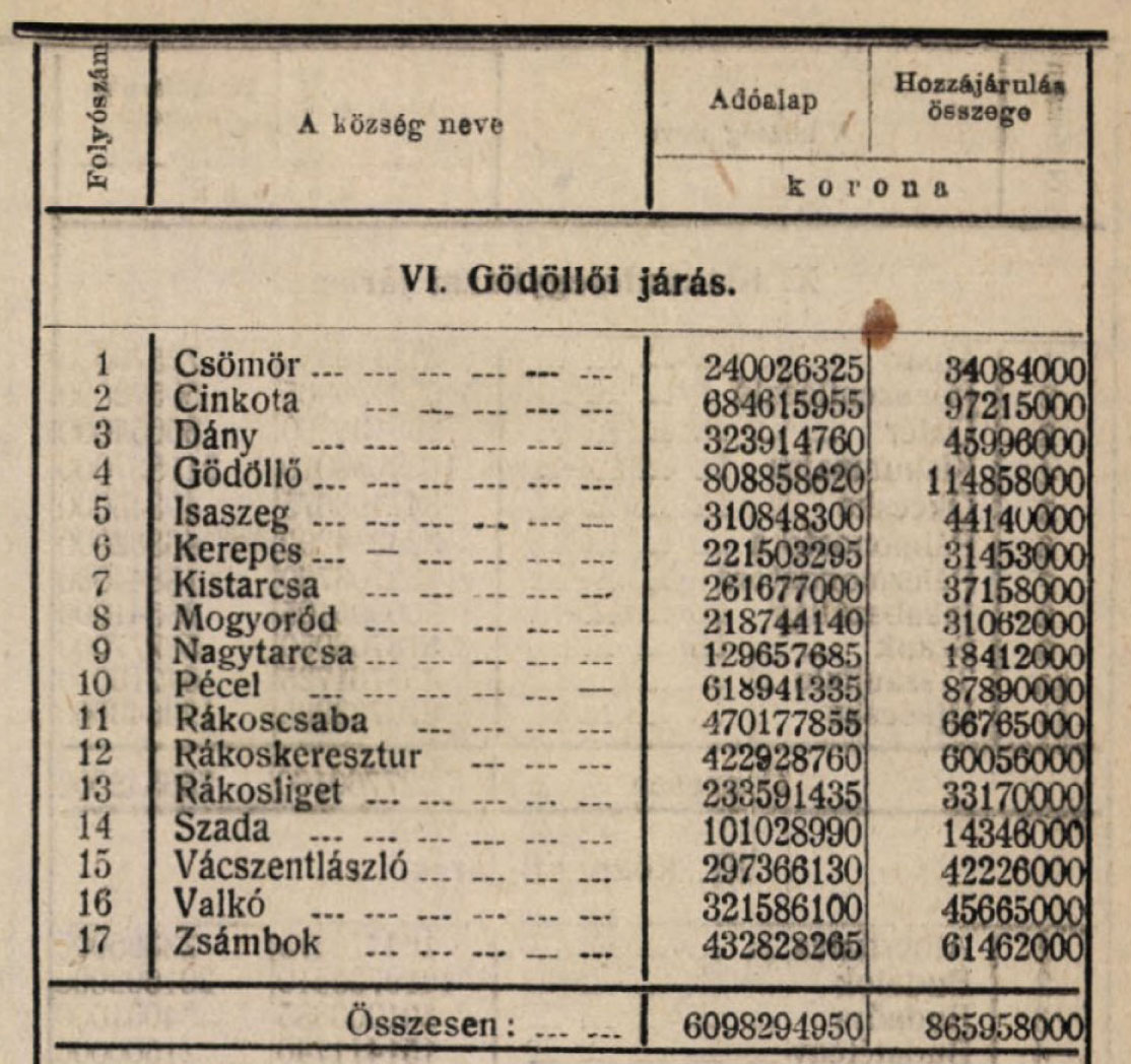 XIV. Gödöllői járásban. Aszód 3880.98, Bag 1647.20, Boldog 2745.22, Csömör 2241.25, Czinkota 4552.99, Dány 2825.17, Domony 1277.06, Galgahéviz 2084.57, Gödöllő 10816.98, Hévizgyörk 1534.94, Iklad 994.74, Isaszeg 2730.13, Kartal 3099.10, Kerepes 1092.52, Kistarcsa 691.18, Mogyoród 1914.01, Nagytarcsa 974.07, Péczel 4466.31, Rákoscsaba 3811.25, Rákoskeresztúr 6065.11, Rákosliget 1735.53, Rákosszentmihály 5214.68, Szada 1245.44, Túra 6484.19, Valkó 1849.59, Váczszentlászló 1396.91, Verseg 4614.20, Zsámbok 3483.56, összesen: 85468 kor. 94 fill.