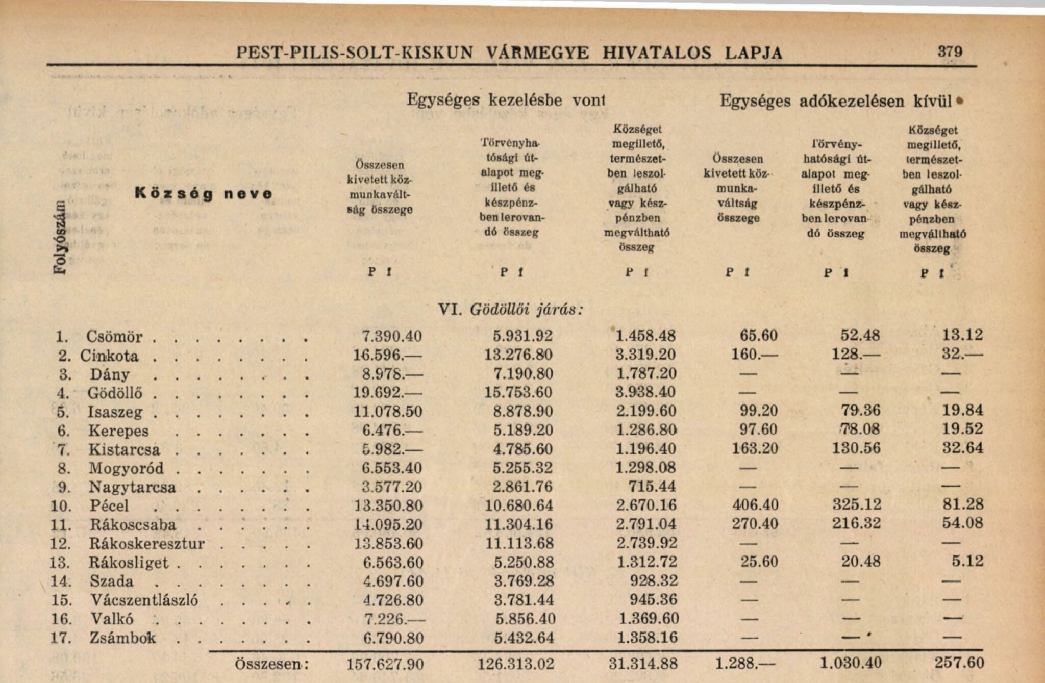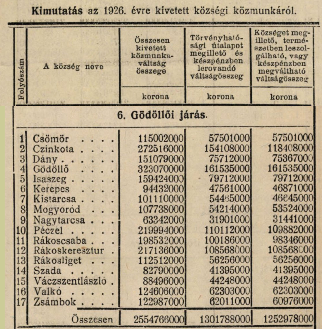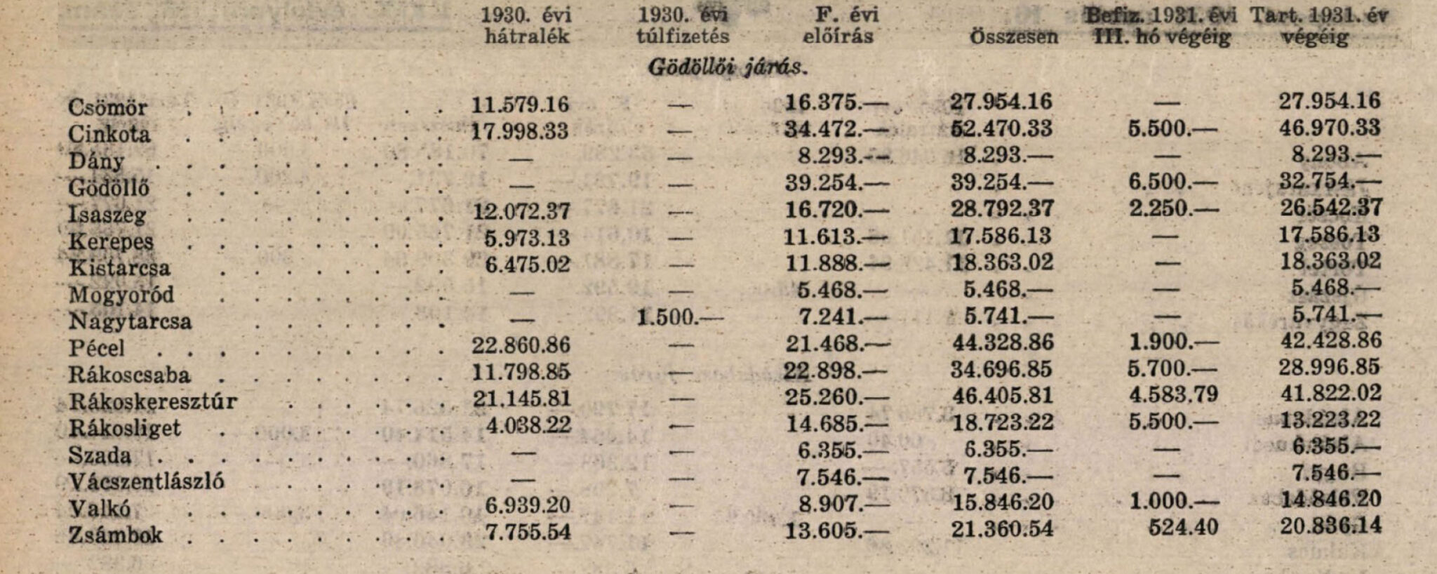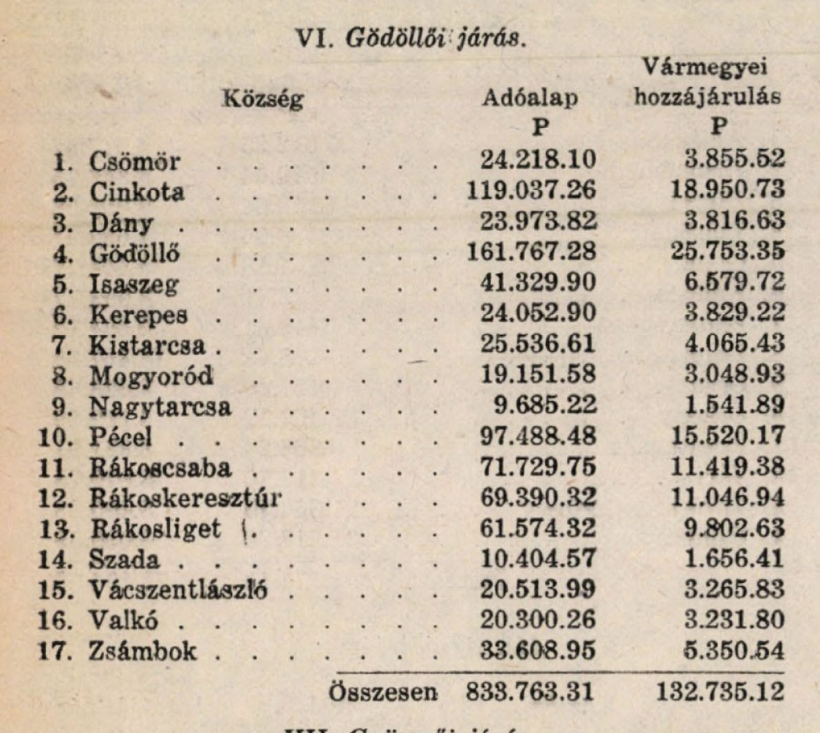 XIV. Gödöllői járásban. Aszód 3880.98, Bag 1647.20, Boldog 2745.22, Csömör 2241.25, Czinkota 4552.99, Dány 2825.17, Domony 1277.06, Galgahéviz 2084.57, Gödöllő 10816.98, Hévizgyörk 1534.94, Iklad 994.74, Isaszeg 2730.13, Kartal 3099.10, Kerepes 1092.52, Kistarcsa 691.18, Mogyoród 1914.01, Nagytarcsa 974.07, Péczel 4466.31, Rákoscsaba 3811.25, Rákoskeresztúr 6065.11, Rákosliget 1735.53, Rákosszentmihály 5214.68, Szada 1245.44, Túra 6484.19, Valkó 1849.59, Váczszentlászló 1396.91, Verseg 4614.20, Zsámbok 3483.56, összesen: 85468 kor. 94 fill.