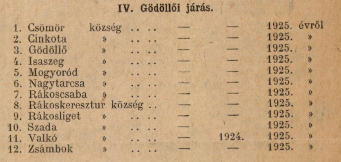 Bag 1095, Boldog 1334, Dány 2S28,_ Galgahcviz 1888, Gödöllő 1402, Hévizgyörk 1352, Isaszeg 888, Túra 1754, Váczszentlászló 23’52, Valkó 1510 és Zsámbok 3016 községekbe elnök Fridrik Béla Hévizgyörk, küld. tag Ubrankovits Dániel Galgahéviz és Kalix Zsigmond Isaszeg, póttag Fáy Barna Váczszentlászló.