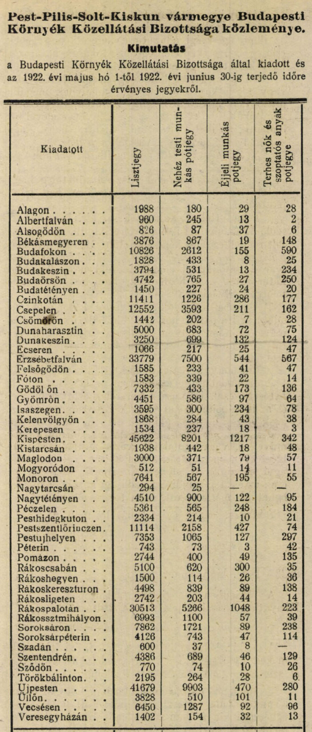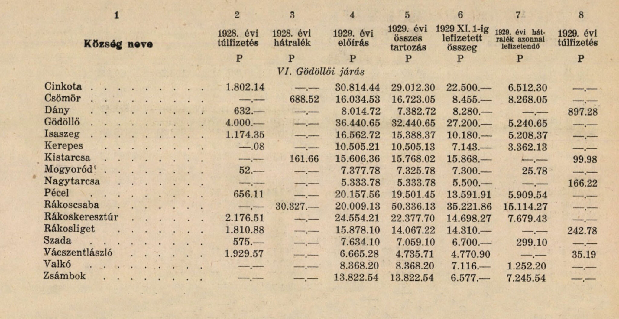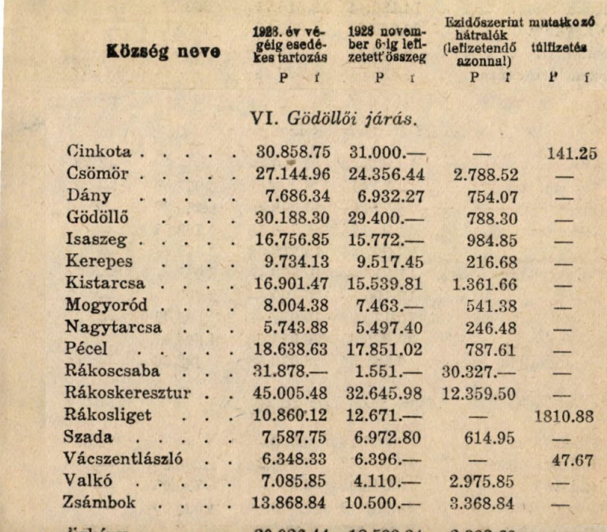 Tószeg, Alsódabas, Tatárszentgyöngy, Aszód, Domony, Galgagyörk, Kartal, Túra, Verseg, Apostag, Dunaegyháza, Dunapataj, Dunavecse, Szalkszentmárton, Csömör, Cinkota, Gödöllő, Isaszeg, Kistarcsa, Nagytarcsa, Rákoscsaba, Rákosliget, Szada, Vácszentlászló, Bátya, Drágszél, Szeretnie, Akasztó, Bocsa, Páhi, Soltvadkert, Pálmonostora, Szánk, Csepel, Soroksár, Kunszentmiklós, Szabadszállás, Bénye, Káva, Tápióbicske, Tóalmás, Kisoroszi, Pilisborosjenő, Pilisszentlászló, Pócsmegyer, Áporka, Dab, Lórév, Makád, Szigetszentmárton, Tököl, Alag és Sződ 1930. évi zárószámadásaikat hozzám még mai napig sem terjesztették