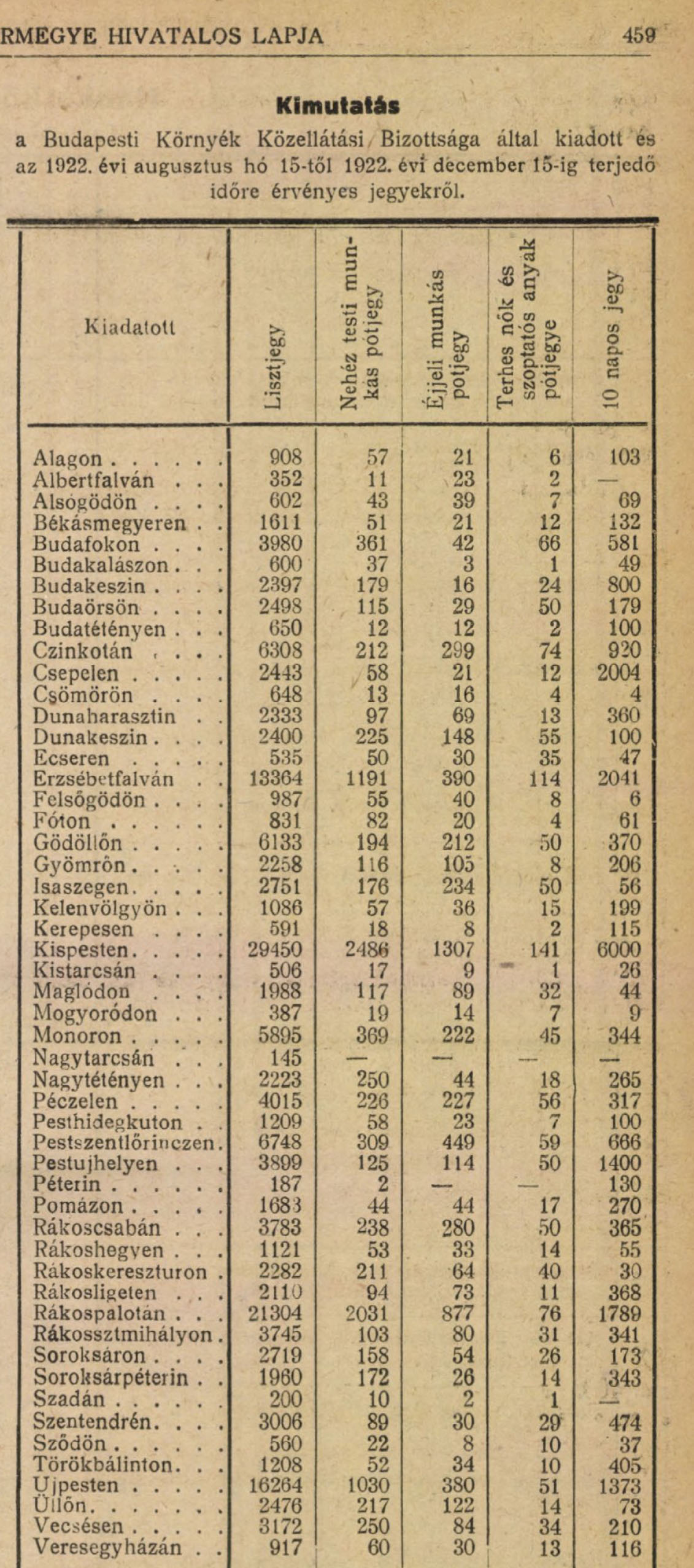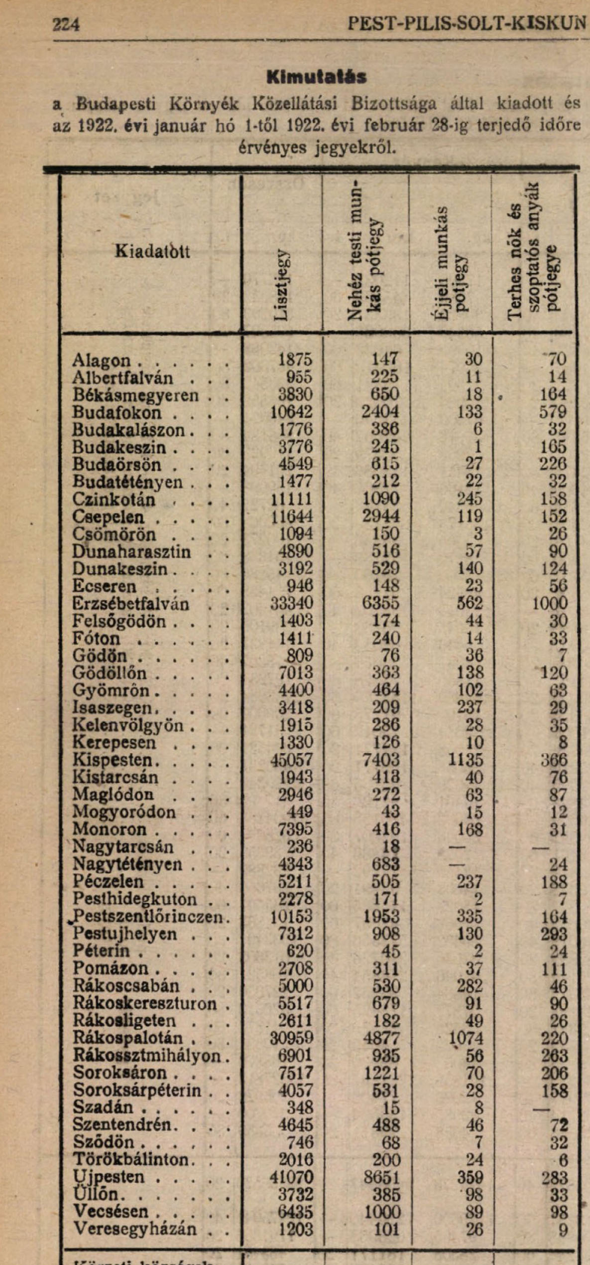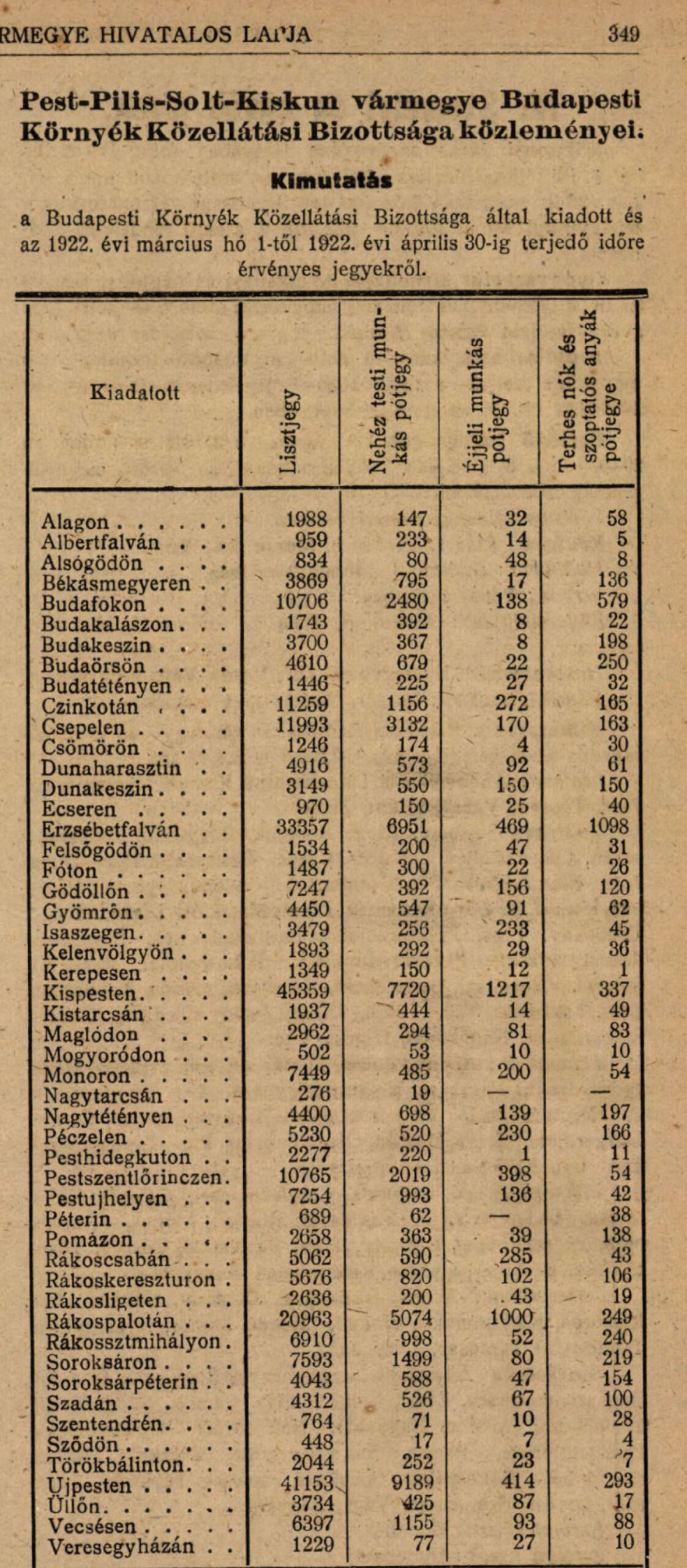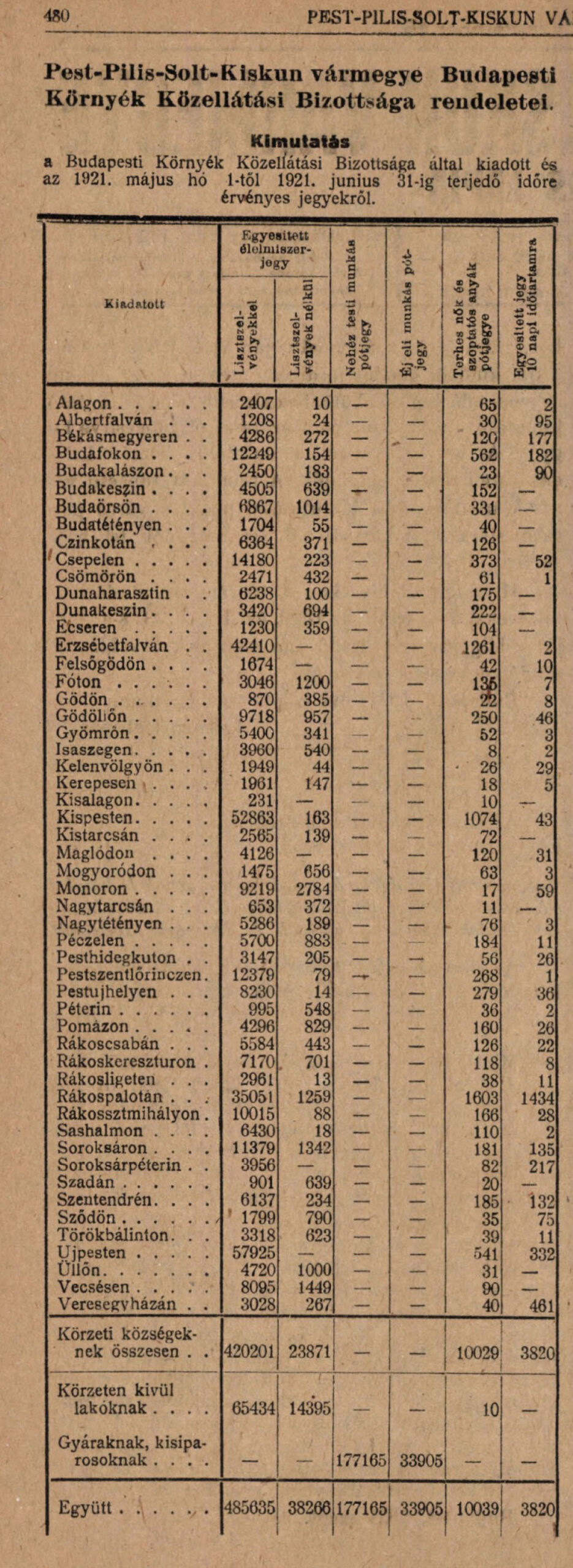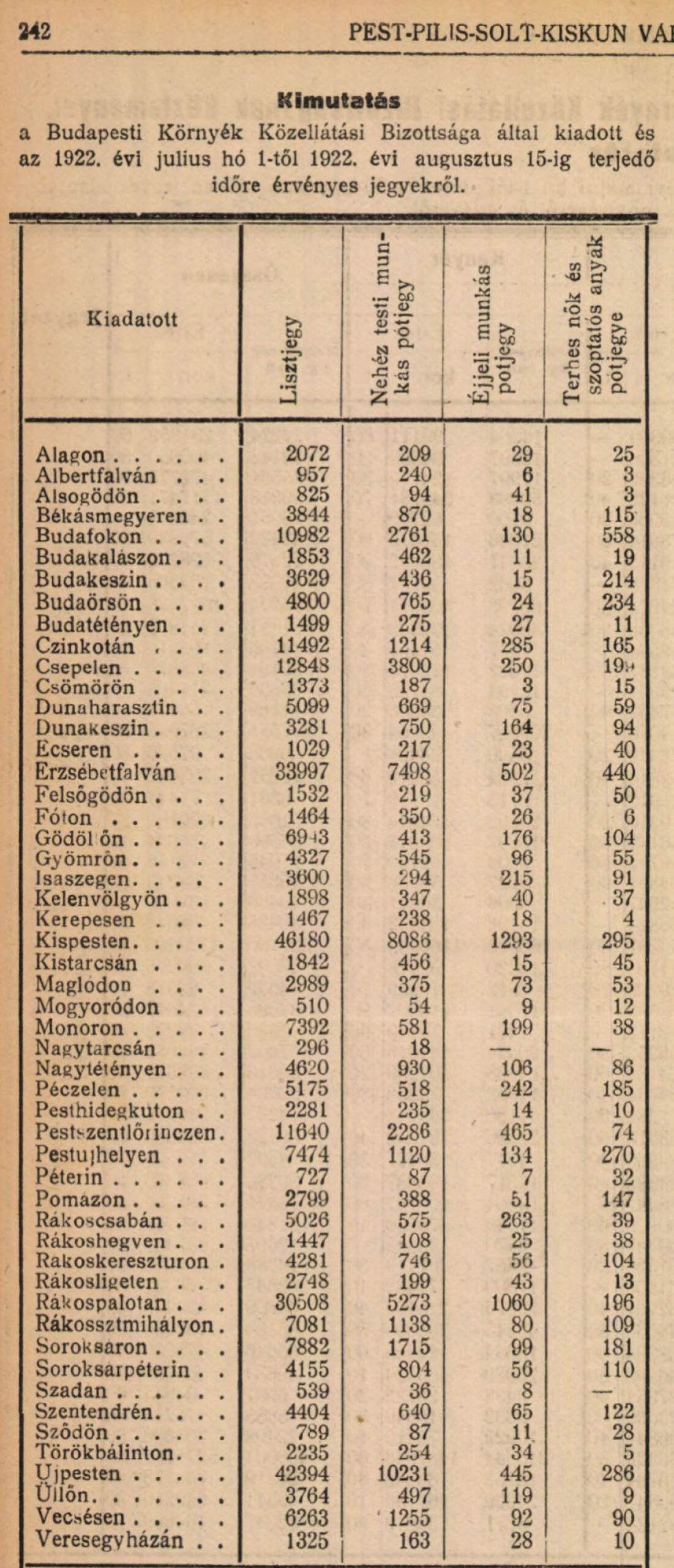 … A vármegye választott bizottsági tagjainak száma az 1886: XXI. tcz. 24. §-ában foglalt rendelkezés szerint 800, és a hivatkozott törvény 29. §-a szerint a 200 vagy annál több választóval bíró községek önálló kerületet alkotnak. A választók száma a folyó évi névjegyzék szerint (a folyó évben megalakult Rákosliget és Ladánybene, továbbá Dunaegyháza községekben az 1909. évi ideiglenes névjegyzékek vétetvén alapul) 58836, e szerint 196, kerek számban 200 választóra egy mandátum esik.