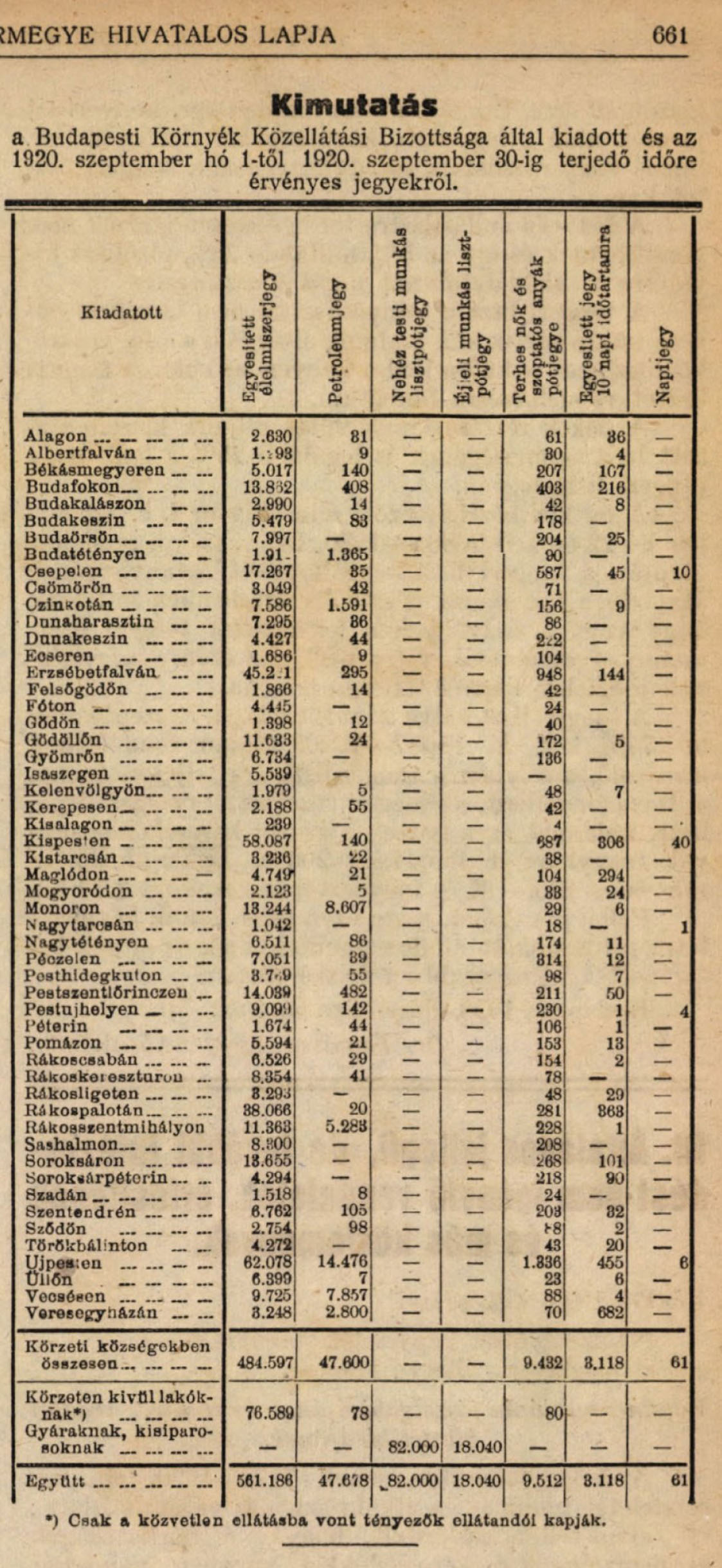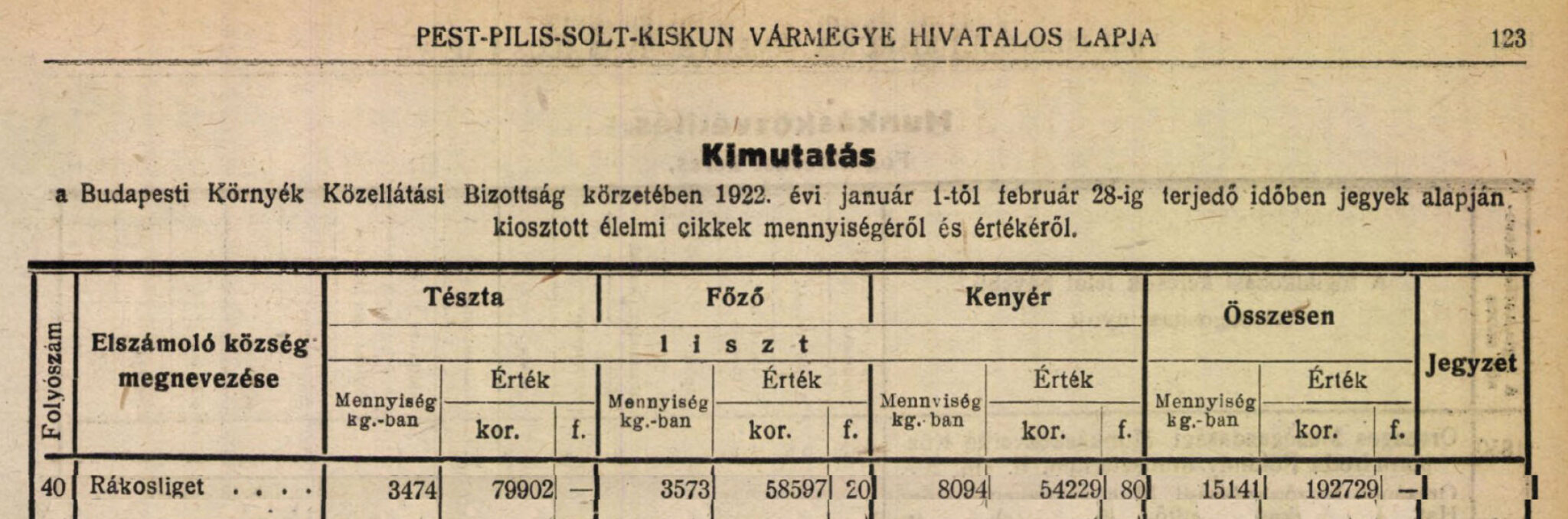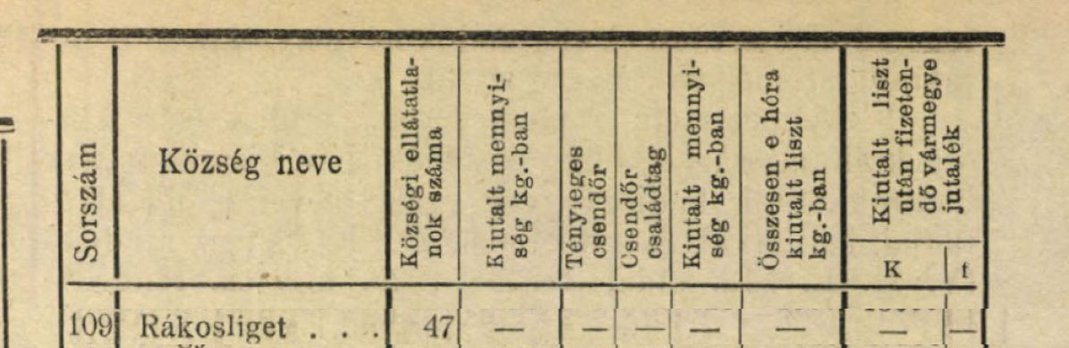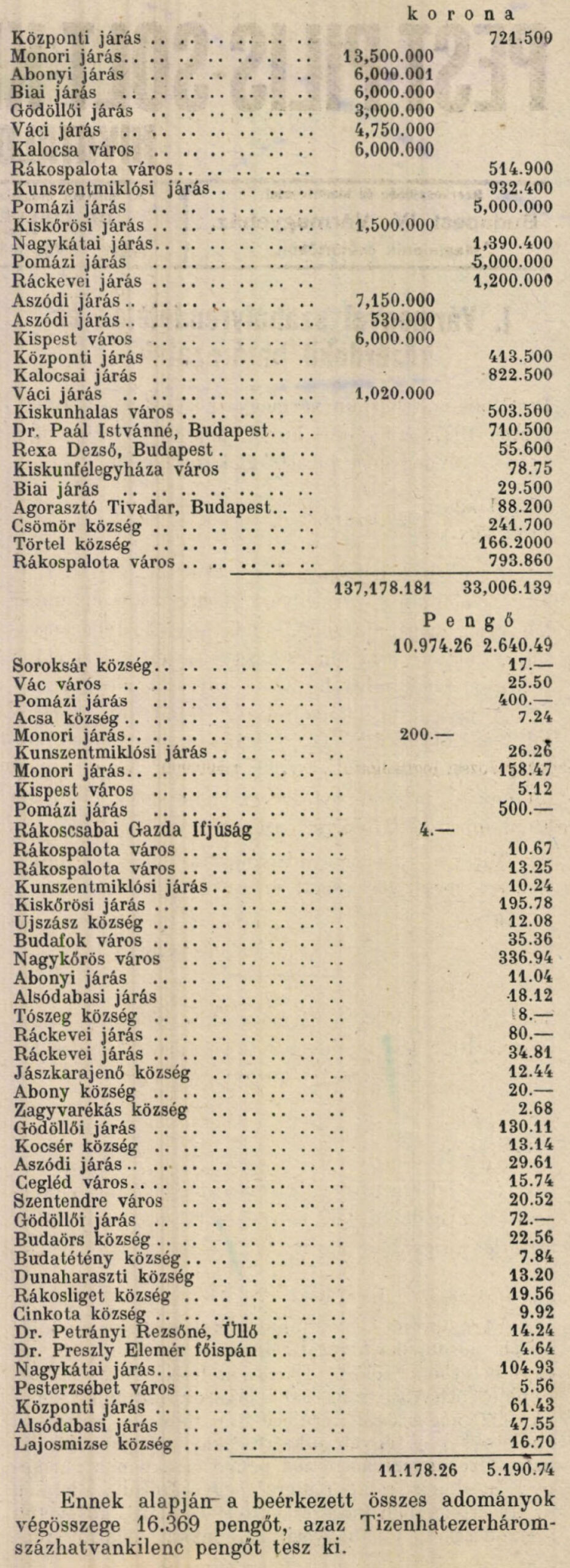 Horthy Miklósáé Ő Főméltósága az ínségesek felsegélyezésére folytatott gyűjtésének eredményéből 6000 P-t, azaz hatezer pengőt kegyeskedett pestvármegyei szükséget szenvedők részére kezeimhez kiutaltatni.
