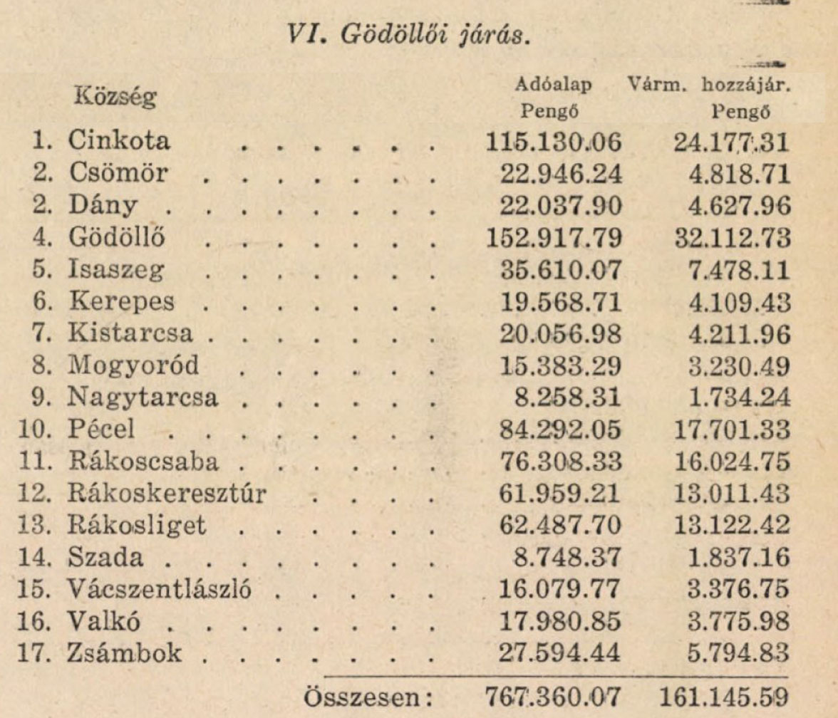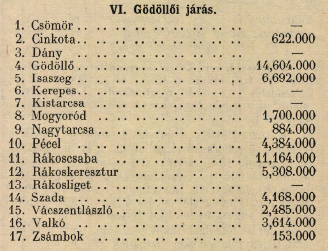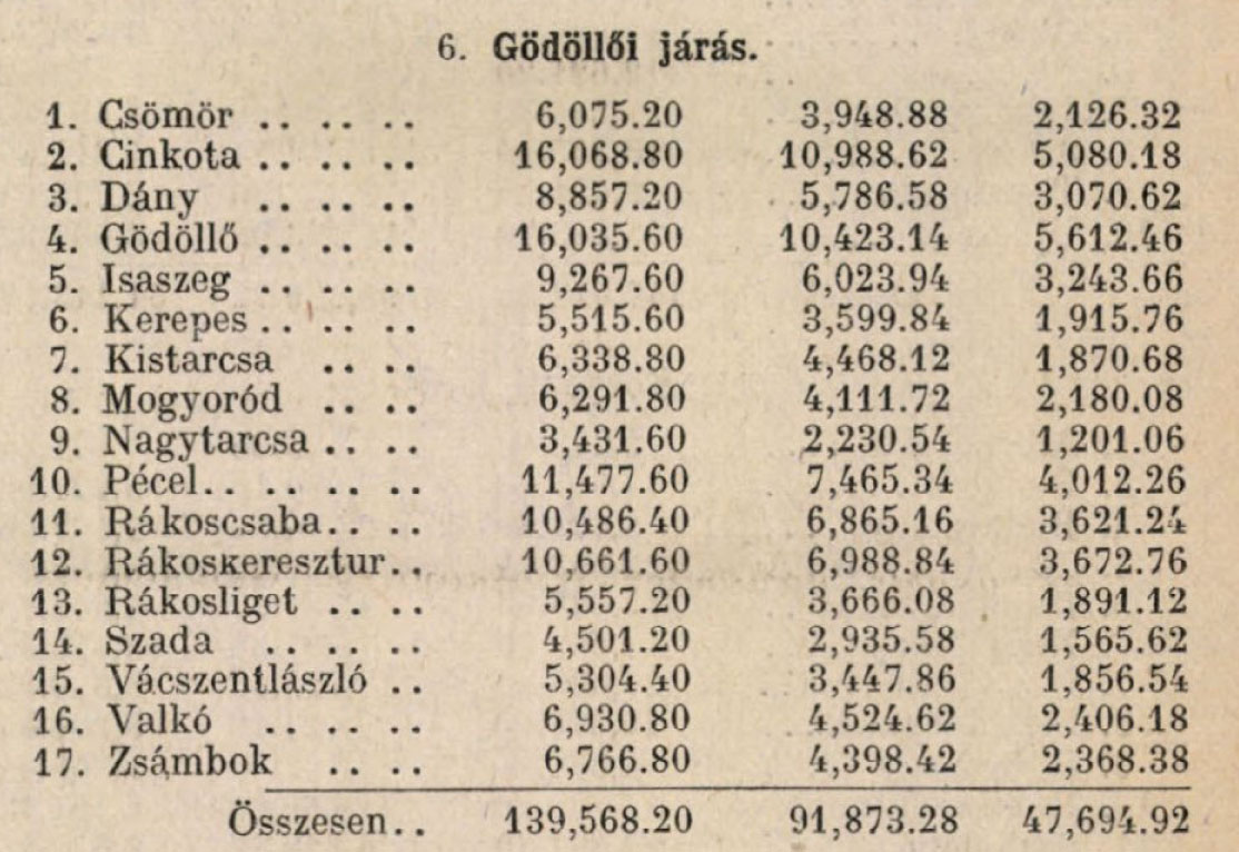 XIV. Gödöllői járásban. Aszód 3880.98, Bag 1647.20, Boldog 2745.22, Csömör 2241.25, Czinkota 4552.99, Dány 2825.17, Domony 1277.06, Galgahéviz 2084.57, Gödöllő 10816.98, Hévizgyörk 1534.94, Iklad 994.74, Isaszeg 2730.13, Kartal 3099.10, Kerepes 1092.52, Kistarcsa 691.18, Mogyoród 1914.01, Nagytarcsa 974.07, Péczel 4466.31, Rákoscsaba 3811.25, Rákoskeresztúr 6065.11, Rákosliget 1735.53, Rákosszentmihály 5214.68, Szada 1245.44, Túra 6484.19, Valkó 1849.59, Váczszentlászló 1396.91, Verseg 4614.26, Zsámbok 3483.56, Ö s s z e s e n : 85468 kor. 94 fill.