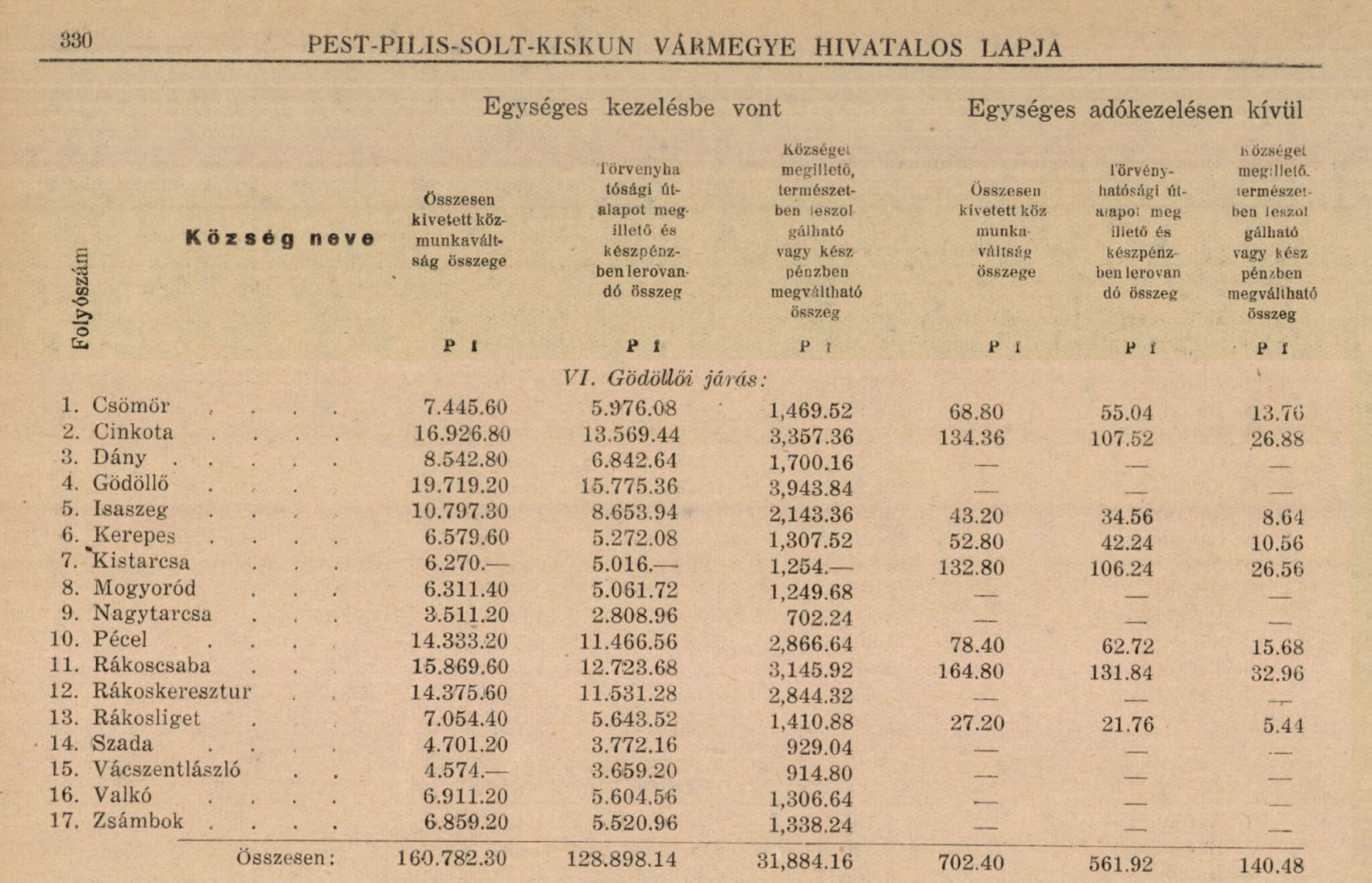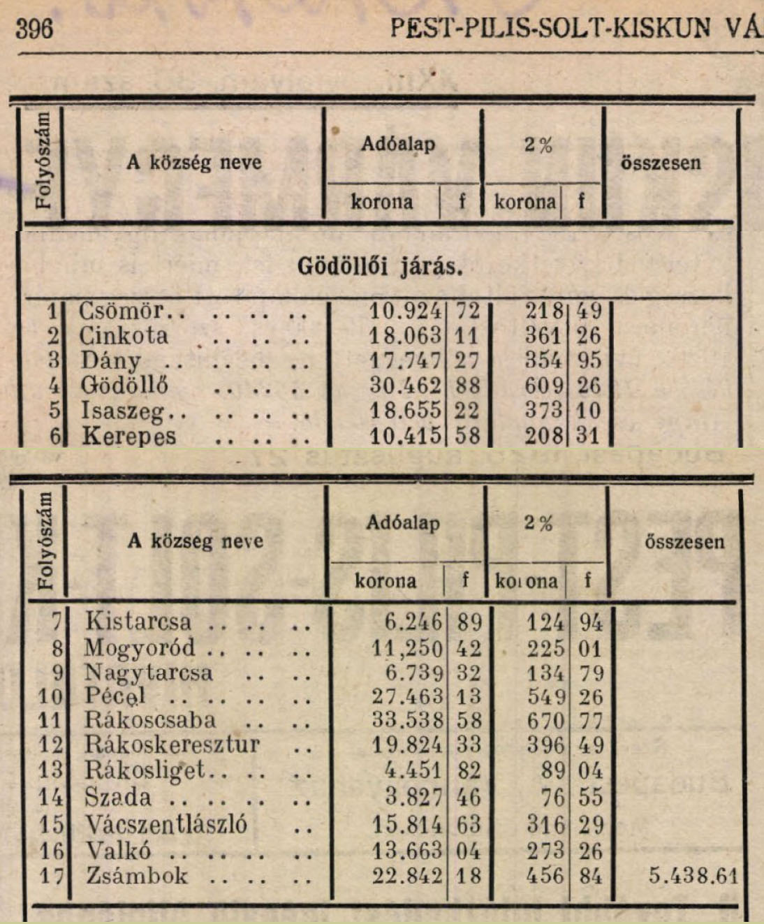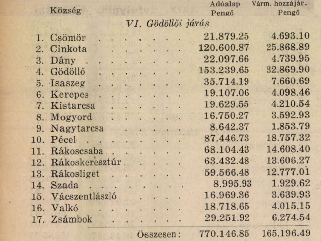 XIV. Gödöllői járásban. Aszód 3880.98, Bag 1647.20, Boldog 2745.22, Csömör 2241.25, Czinkota 4552.99, Dány 2825.17, Domony 1277.06, Galgahéviz 2084.57, Gödöllő 10816.98, Hévizgyörk 1534.94, Iklad 994.74, Isaszeg 2730.13, Kartal 3099.10, Kerepes 1092.52, Kistarcsa 691.18, Mogyoród 1914.01, Nagytarcsa 974.07, Péczel 4466.31, Rákoscsaba 3811.25, Rákoskeresztúr 6065.11, Rákosliget 1735.53, Rákosszentmihály 5214.68, Szada 1245.44, Túra 6484.19, Valkó 1849.59, Váczszentlászló 1396.91, Verseg 4614.26, Zsámbok 3483.56, Ö s s z e s e n : 85468 kor. 94 fill.