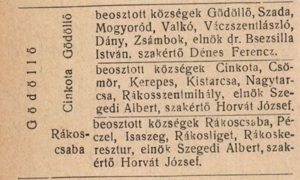 Czinkota 1570, Csömör 1120, Ecser 1918, Kerepes 1394, Kistarcsa 1505, Maglód 1476, Mogyoród 396, Nagytarcsa 1566, Péczel 999, Rákoscsaba 2502, Rákoskeresztúr 806, Rákosliget 806 és Rákosszentmihály 1120 községekbe elnök Zachár Kálmán Gödöllő, küld. tag Bitskey Gyula Csömör és Igó Elek Ecser, póttag Fáy Aladár Nagytarcsa.