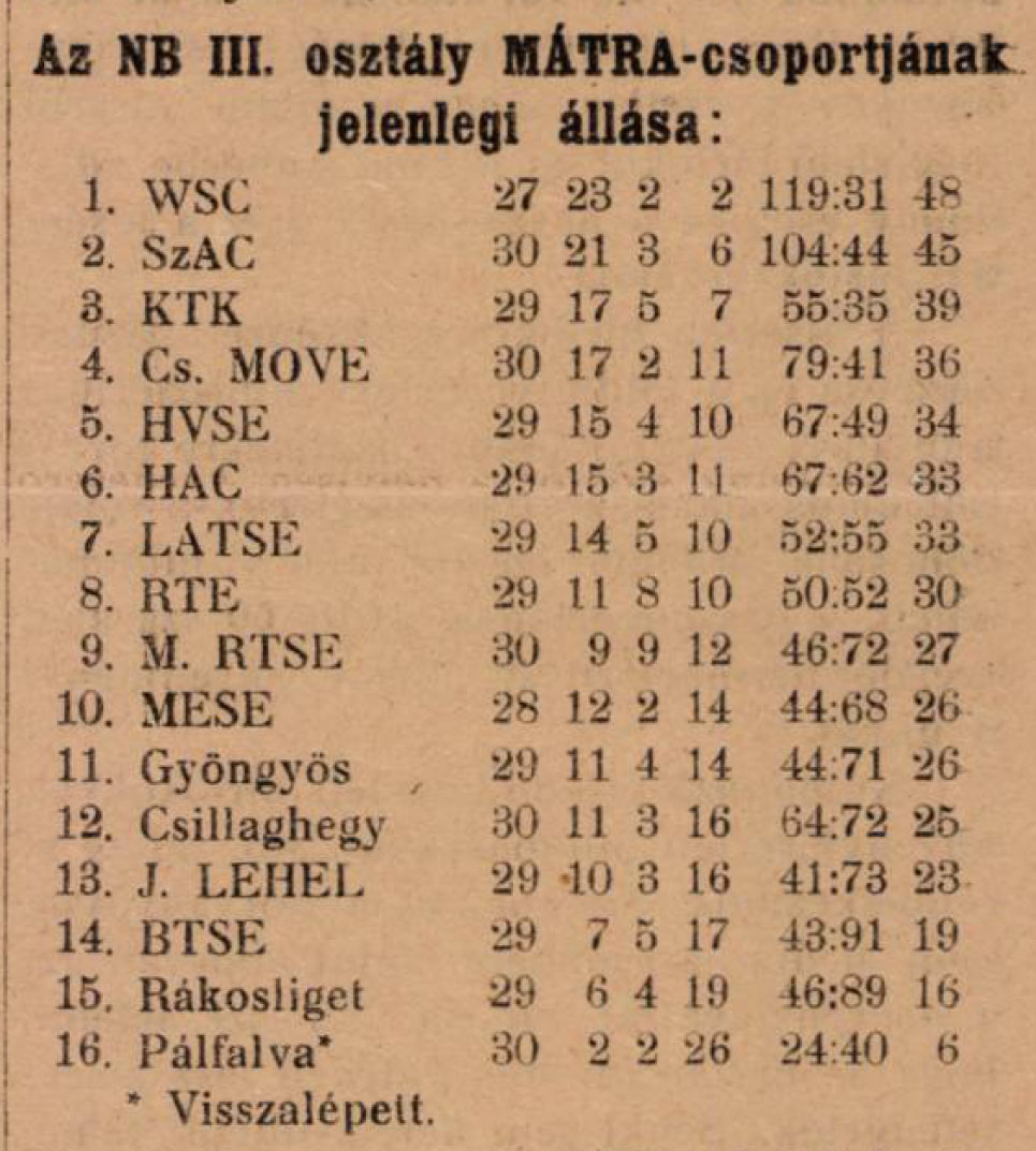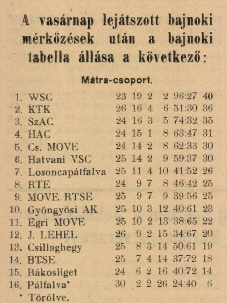 | 9 | MOVE Egri SE | 30 | 12 | 3 | 15 | 46 : 70 | 27 |