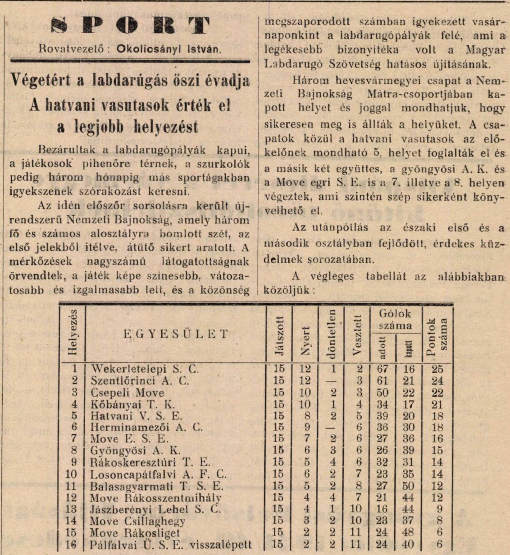 | 5 | Hatvani Vasutas SE | 30 | 16 | 4 | 10 | 69 : 49 | 36 |