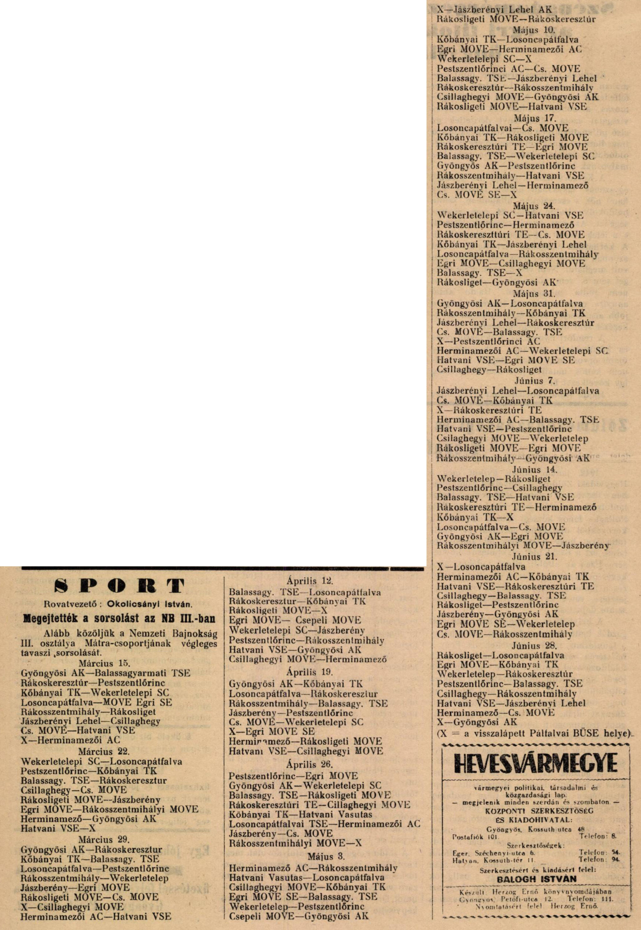 | 6 | Losoncapátfalvai TSE | 30 | 15 | 5 | 10 | 61 : 59 | 35 |