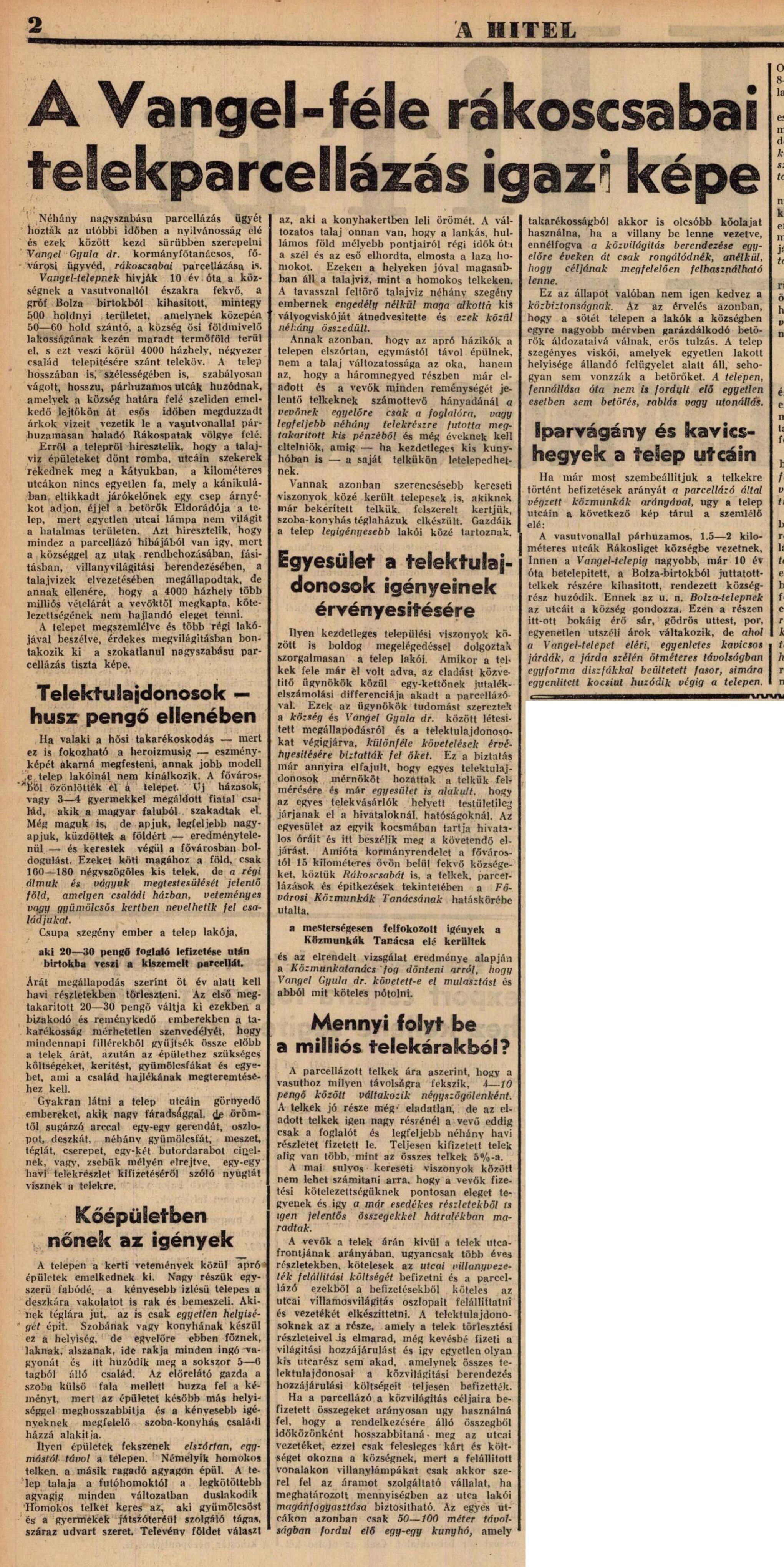 — Új tisztviselő-otthon Rákosligeten . A budapesti állami tisztviselők számos tagjából alakult bizottság már huzamosabb idő óta foglalkozik egy új tisztviselő-otthon létesítésének tervével. Az előkészítő bizottság a terv kivitelét a fővárostól alig 25 perenyi távolságban fekvő Rákosliget község mellett 400, a legmodernebb angol, illetve amerikai rendszer szerint megépítendő családi ház építésére igen alkalmas
