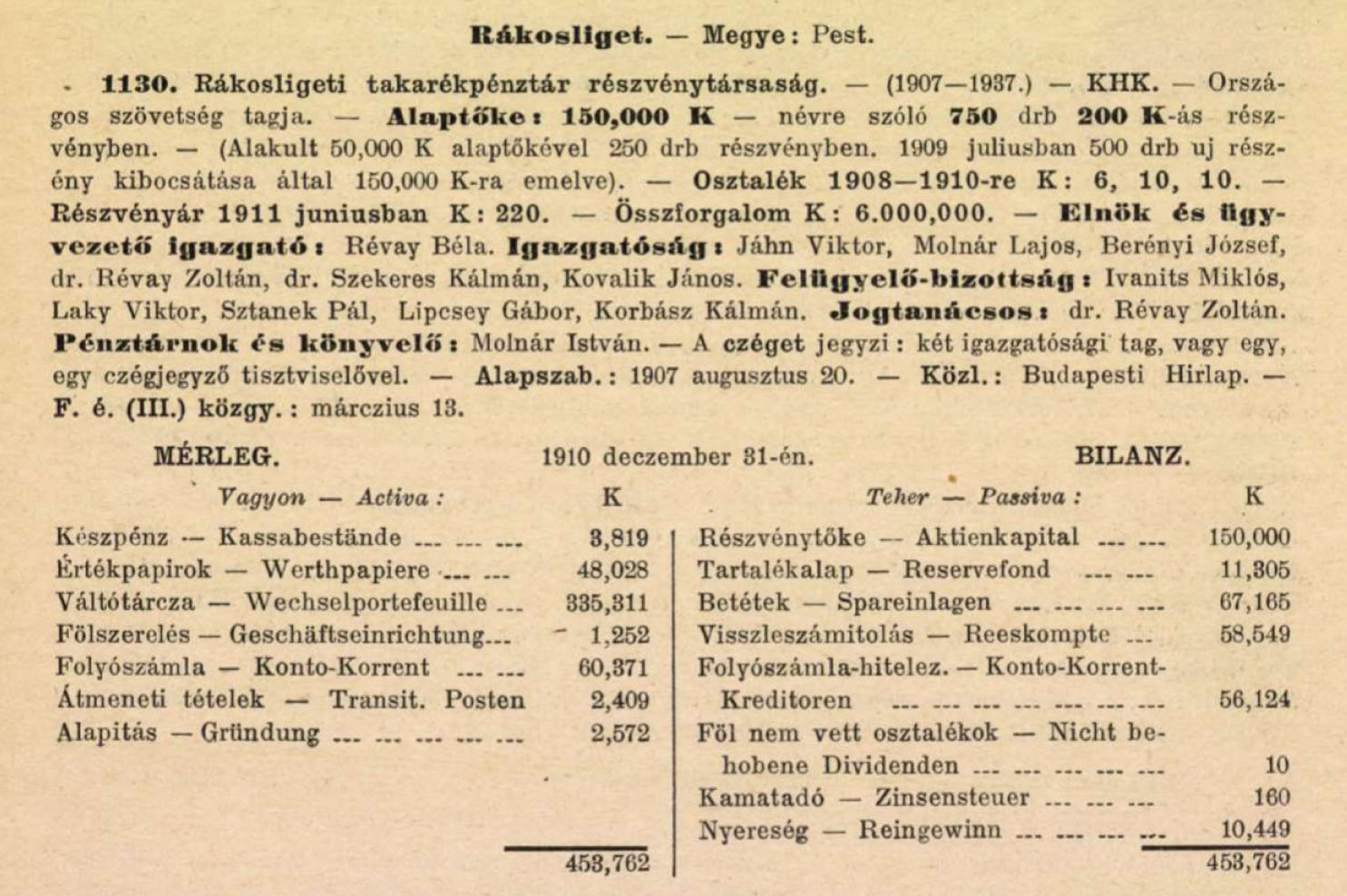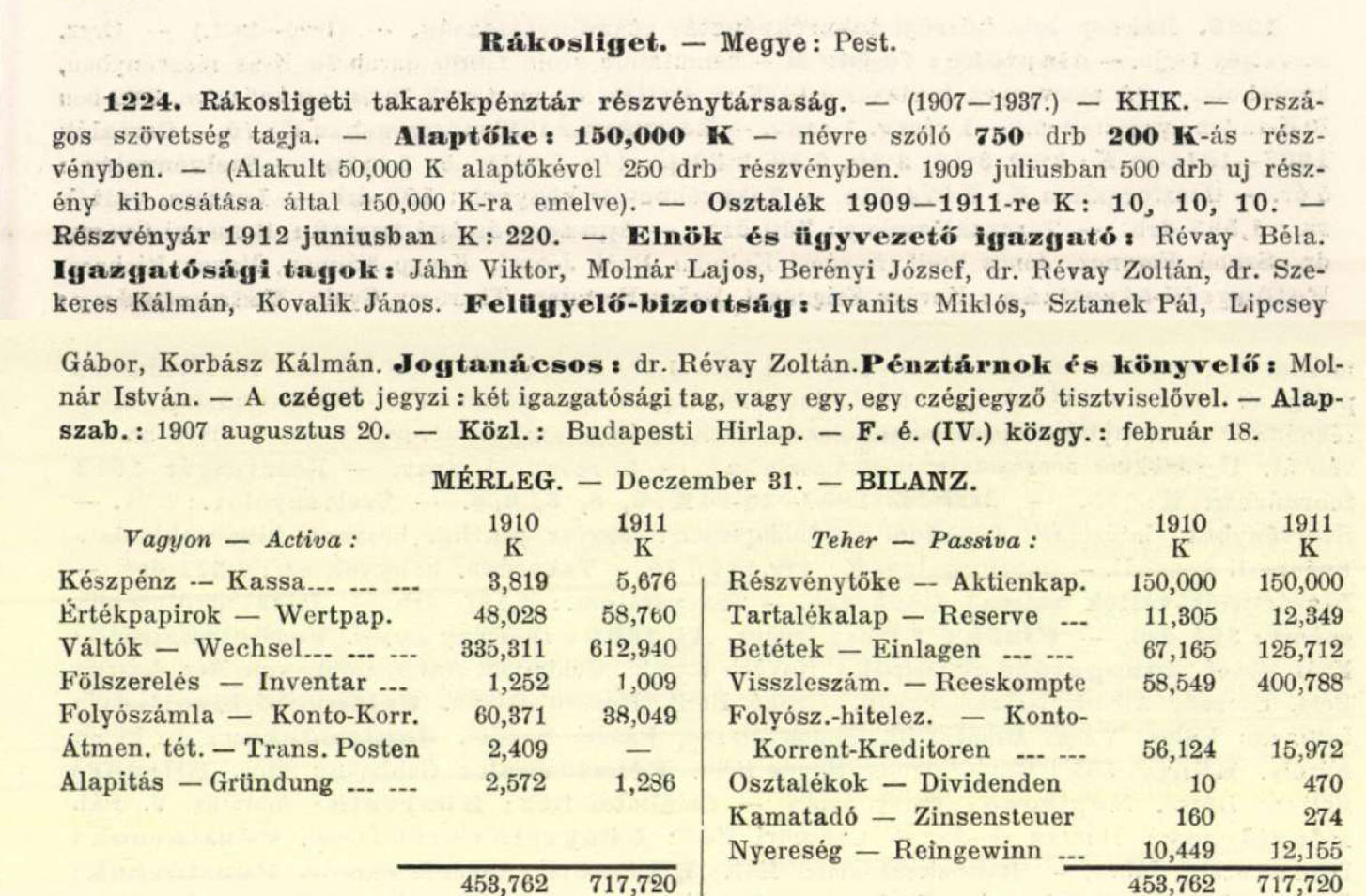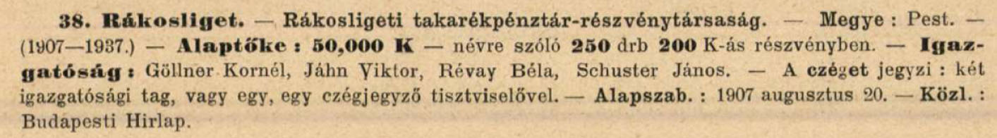 1908. Rákosvidéki takarékpénztár bejegyezve. Tiszti címtár 1908