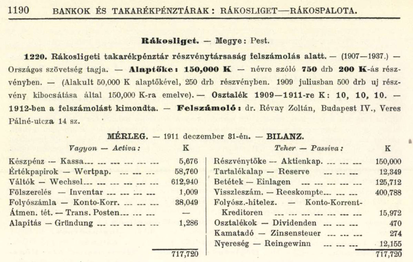 Rákosvidéki Takarékpénztár felszámolása. Rákosligeti Segélyszövetkezet. Tiszti Név- és Címtár