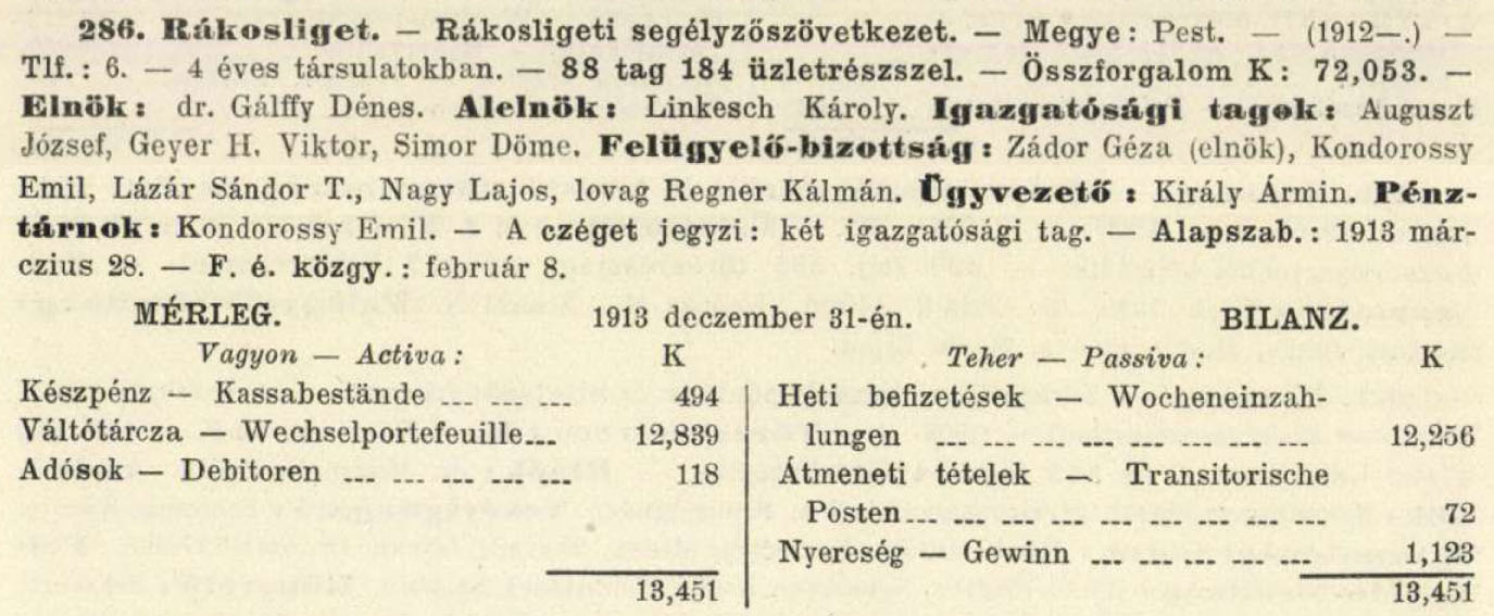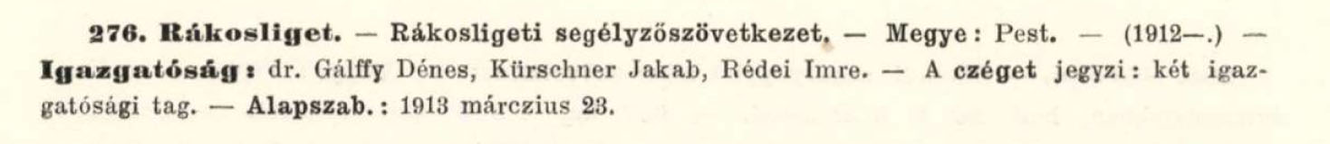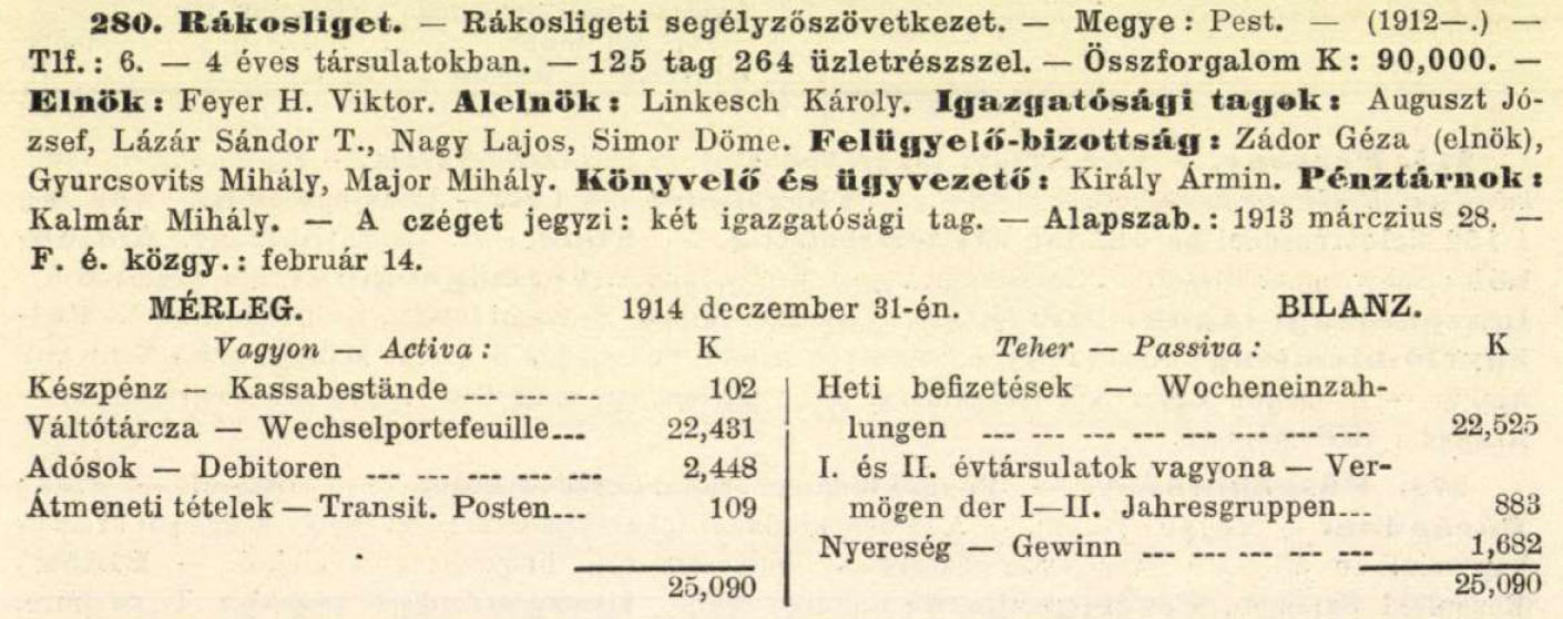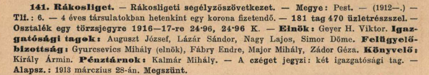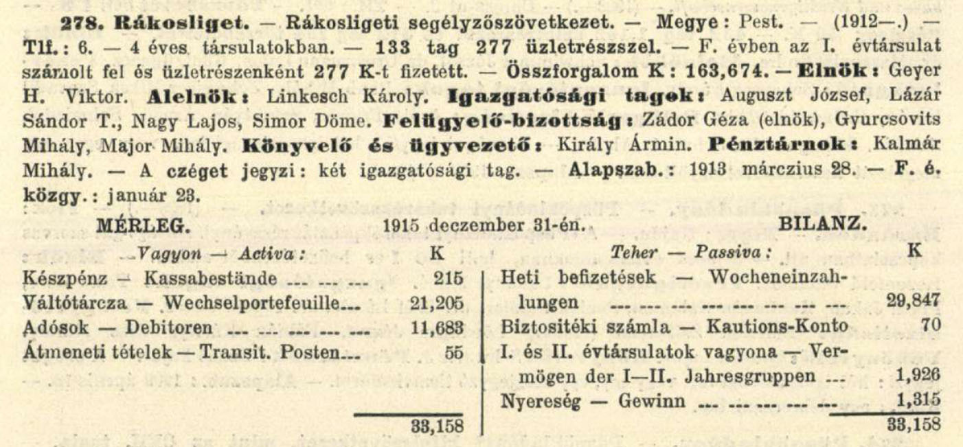 RÁKOSLIGETI SEGÉLYEZŐ SZÖVETKEZET 1913 Forrás: Magyar Compass 1913 1914 Forrás: Magyar Compass 1914 1915 Forrás: Magyar Compass 1915 1916 Rákosligeti Segélyző Szövetkezet Forrás: Magyarország tiszti cím- és névtára – 35. évfolyam, 1916 Forrás: Magyar Compass 1916 1920 Forrás: Magyar Compass