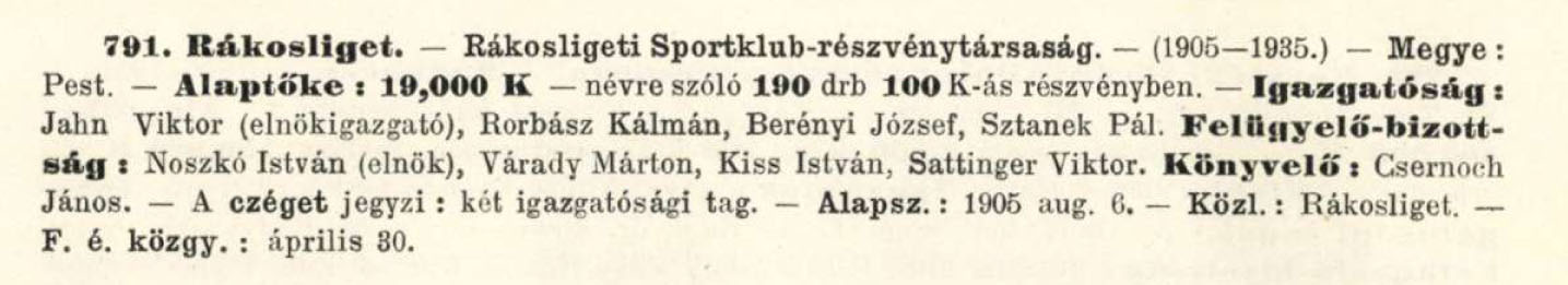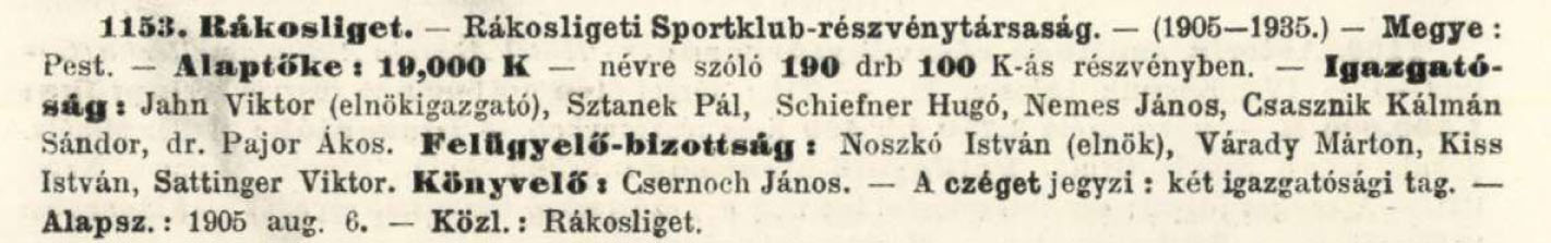 Rákosliget lakosságának tíz vezető férfia elhatározta, hogy Rákosligeti Sport-Klub néven a testedzés minden ágát művelő egyesületet alapít és különösen fiatalság testi nevelésének előmozdítására megfelelő sporttelepet állít. Schuster János elnökigazgató, Schochterus Ottó és Jahn Viktor igazgatók, Majnik Ferenc főhadnagy, titkár, Kundráth Gyula, Ürge Károly, Sztanek Pál, Geyer H. Viktor, Glass József és Korbess Kálmán alapítók egyenkint 1000 koronával járultak hozzá a sporttelep létesítéséhez, a melynek alaptőkéje a még befolyt adományokkal immár 12.000 koronára növekedett. A sporttelep Rákosliget határán a legmodernebbül épült és a vidéken úgyszólván egyedül álló. A Rákosligeti Sport-Klub, mint társadalmi testület, hivatva lesz a testnevelés ügyét a rákosligeti társadalomban népszerűvé tenni. Hogy a terv keresztülvitele milyen lelkesedést keltett, bizonyítja, hogy Majnik Ferenc főhadnagy önzetlenül fölajánlva szolgálatait, Rákosligeten körülbelül száz főnyi ifjúsági századot képez ki a katonai gyakorlatokra. Burger Ferenc tornatanító pedig a leánykákkal kedveltette meg a testgyakorlást. A sporttelep fejlesztésére még Marta György, Bíró Ferenc, Kovács Elek, Rácz Mihály dr., Virter János és neje, Kovácsevics (helyesen: Kovácsovics) J., Fuchs Ármin és Géza, Buda Jenő, Leiterek Lujza, Noszkó István áldozott tekintélyes összegeket.