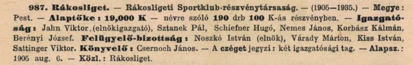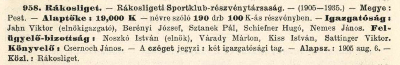 A rákosligeti sporttelep. Rákosligeten „Rákosligeti Sport-Club” néven a testedzés minden ágát művelő egyesületet alapítottak, s amely különösen a fiatalság testi növelésére fektetve súlyt, megfelelő sporttelepet létesített. Schuster János elnök-igazgató, Schochterus Ottó és Jahn Viktor igazgatók, Hajnik Ferenc (főhadnagy) titkár, Kundráth Gyula, Ürge Károly, Sztanek Pál, Geyer H. Viktor, Glass József és Korbass Kálmán alapítók egyenkint 1000 koronával járultak hozzá a sporttelep létesítéséhez, melynek alaptőkéje a még befolyt adományokkal együtt immár
