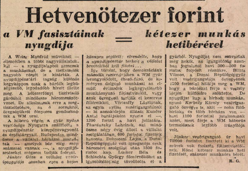 1944 október elején Thuránszky Lehel, aki akkor a Weiss Manfréd Művek tisztviselője volt, arról értesített, hogy a németek le akarják szerelni, és el akarják szállítani a kőbányai sörpincékben működő Dunai Repülőgépgyár berendezéseit és a szakmunkásokat Németországba akarják áttelepíteni. Losonczy Géza — aki az egyik illegális kapcsolatom és munkatársam volt, s akinek ezt tudomására hoztam — néhány nap múlva közölte, hogy a párt utasítására rendszeres harc indul a termelőeszközök és a munkásság elhurcolása ellen.