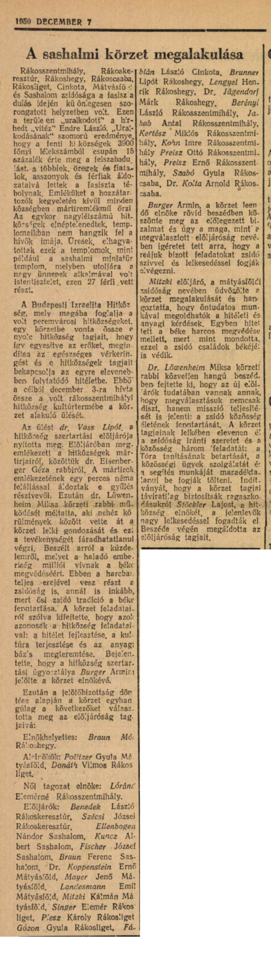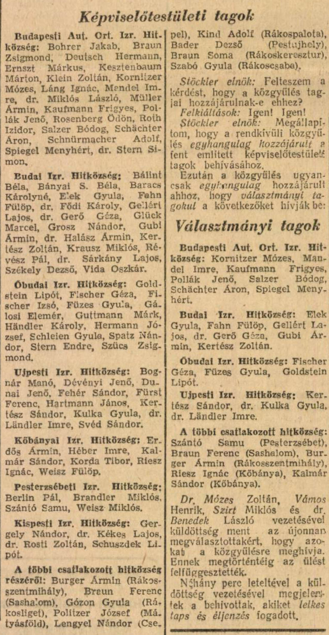Végül mondja ki a közgyű!és, hogy ünnepélyesen mai ülésének jegyzőkönyvébe iktatja a Pesti Izraelita Hitközséghez csatlakozott, illetőleg a vele egyesült testvér hitközségek, chevra kadisák, nőegyletek és más vallási jellegű egyesületek nagy és történeti érdemeit. A közgyűlés hálát ad a Mindenhatónak, hogy ezen zsidó közösségek és intézmények útján sikerült eddig fenntartani Budapest főváros területén a hagyományos zsidó vallási életet és teljesíteni a zsidó vallás által előirt parancsolatokat. S most, midőn mindezen szervezetek feladatkörét az egységes hitközség átveszi, a hitközség képviselőtestülete a Mindenhatóhoz fohászkodik, hogy adjón kitartást a hitközség vezetőségének és minden egyes tagjának ahhoz, hogy az erők egyesítésének e történeti korszakában meg tudják alapozni az új egységes hitközséget, amely szervezetében, célkitűzéseiben és dolgozó munkatársaiban alkalmas legyen arra, hogy az átvett feladatókát megvalósítsák. Ehhez adjón a Mindenható elsősorban békét, amely alapja minden munkának, így a zsidó munkának is. A békéért való tántoríthatatlan küzdelem hassa át az új egységes Budapesti Hitközség minden tagját. …