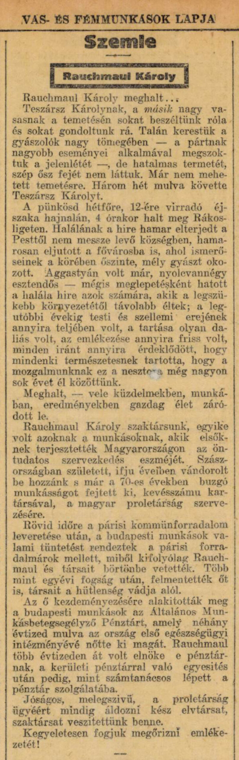 VAS ÉS FÉMMUNKÁSOK LAPJA vissza a sajtóhírek lapra 1916 1906. 06. 22. 5. oldal Rauchmaul halála vissza a lap tetejére vissza a sajtóhírek lapra
